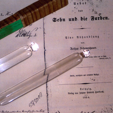 Betrachtet man die Fotografie, so trifft zunächst ein Lichtreflex das Auge. Er geht von dem mittleren der drei länglichen, parallel angeordneten Gegenstände aus und wurde wohl durch die Belichtung der Kamera bei der Aufnahme des Bildes erzeugt. Die beiden vorderen, auf der Fotografie sichtbaren Gegenstände sind fein gearbeitete Prismen aus G...