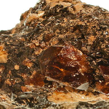 Ungewöhnlich große und als Edelstein unter dem Namen Hyazinth bekannte Einzelkristalle können am Ende der Erkaltung magmatischer Tiefengesteine entstehen, so wie dieser bernsteinfarbene Zirkon in einem Syenit. Die meisten der für die Wissenschaft verwertbaren Zirkone sind allerdings mikroskopisch klein und mit bloßem Auge kaum zu erkennen. ...