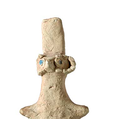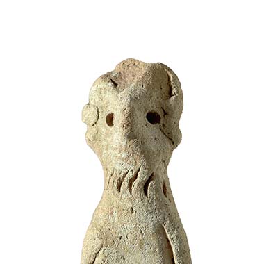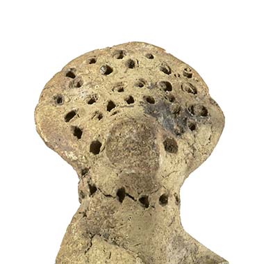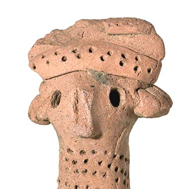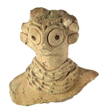 Der Kopf weist eine breite und runde Form auf. Die Augen sind durch aufgesetzte Tonscheiben dargestellt, die in der...