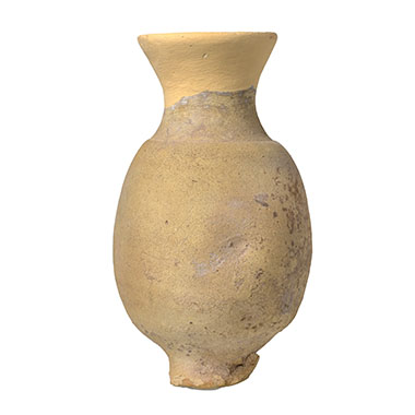 The shape of this clay vessel with its characteristic opening is called a lekythos and was produced in ancient Greece during the 6th and 5th centuries BC as a perfume bottle. Its colour and painting with incisions are characteristic of the so-called Attic vases, i.e. vessels made in Athens. Even though ancient vases are often broken due to their gr...