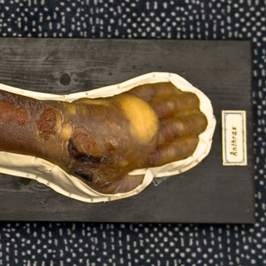 Die Wachsplastik zeigt das Krankheitsbild der akuten tiefen Bartflechte mit Entzündung und Schwellung der betroffenen Hautpartien. Diese früher vor allem vom Rind auf den Menschen übertragene Hautpilzerkrankung ist durch die Impfung der Kälber in Europa so gut wie verschwunden. Das macht dieses Objekt noch jetzt für die ...