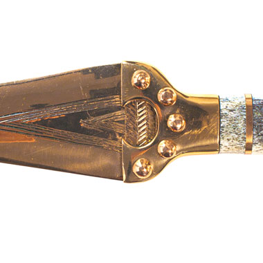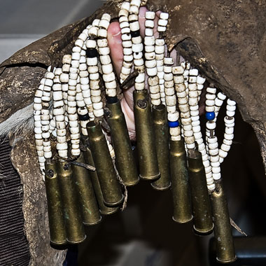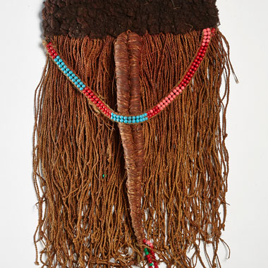 Dieses in der Sammlung des Kölner Afrikanisten Oswin Köhler (1911–1996) am Institut für Afrikanistik aufbewahrte Ducker-Fell benutzten die Kxoé, eine Volksgruppe der San, als Schurz. An den oberen Ecken läuft das Fell in kurzen, an den unteren Ecken in langen Zipfeln bzw. Streifen aus. Das Fell ist reich verziert, mit Perlen und Patronenh...