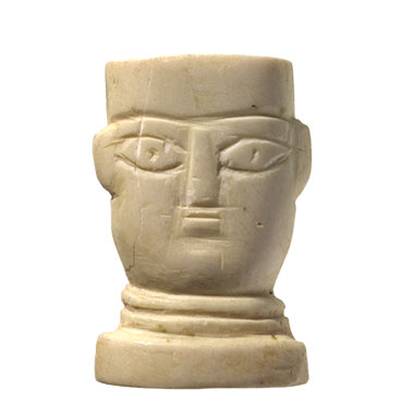 Aus dem hellenistischen Ägypten stammt ein kleines Intarsienköpfchen aus Knochen. In der Rückansicht ist die schwammartige Struktur des Knochens (Spongiosa) deutlich zu erkennen. Die eher grob geschnitzte Vorderseite zeigt ein geschlechtsneutrales Gesicht mit klei...