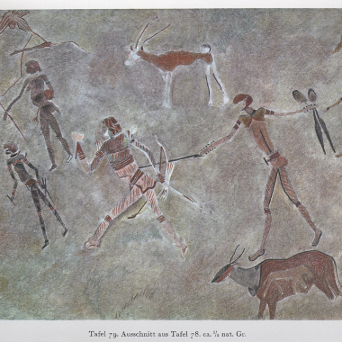 Schreitender Mann mit Elefantenkopf ist Bestandteil einer Sammlung, die von Leo Frobenius (1873 – 1938) zur Dokumentation und wissenschaftlichen Erforschung der Kulturgeschichte der Menschheit aufgebaut wurde und heute als eine der ältesten und umfangreichsten Felsbildsammlungen weltweit gilt. Bei dem Aquarell handelt es sich, verglic...