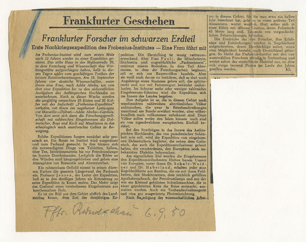 »Erste Nachkriegsexpedition des Frobenius-Institutes – Eine Frau fährt mit« heißt die Überschrift in einem Artikel der Frankfurter Rundschau vom 6. September 1950. Zielwar die Erforschung der bis dahin fast unbekannten Ethnien im Gebiet südlich des Konso im äthiopischen Hochland in Abessinien. Wir sind über den Expeditionsverlauf sehr gut durch die mitreisende »Frau« Elisabeth Charlotte Pauli informiert, die in humorvollen und anschaulichen Briefen an ihre Mutter darüber berichtete. Pauli nahm als Mitarbeiterin und Malerin unter der Leitung ihres späteren Mannes, des Ethnologen Adolf Ellegard Jensen (1899 – 1965), an der zweijährigen Exkursion teil. Die Pressemitteilung zeigt die etwas spießige Haltung der 1950er-Jahre. Denn die Kölner Bürgerstochter hatte schon in den 1930er-Jahren Leo Frobenius (1873 – 1938) auf seinen Expeditionen in die Libysche Wüste, nach Südfrankreich und nach Spanien begleitet.