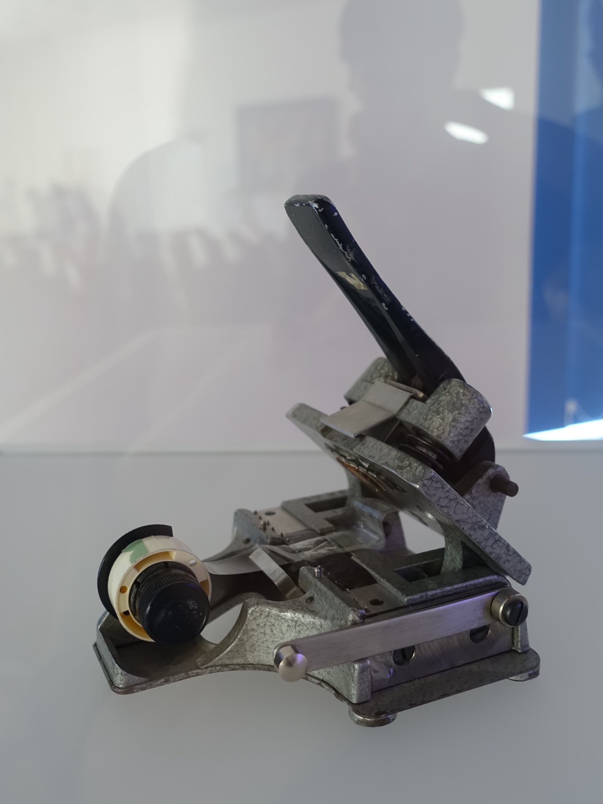 The Film Splicer has a dual function: 1st acute crisis intervention during analog projection (film tear) or 2nd care work in the 16mm archive (repairing perforation damage, attaching film leader etc.). If a crack is too splintered, the guillotine-like vertical knife removes the adjacent images. The tear becomes a cut. The knife retracts autonomously and then remains discreetly in the background. For gluing, the tape is stretched over the inserted filmstripe to the other side and pressed on. The horizontal blades cut precisely along the film edge and release the stripe with a new perforation. What remains is a piece, an initially flat and transparent film, that piles up into an opaque block with each gluing.Bettina Schulte-Strathaus is the custodian of the 16mm Film Archive at the Goethe University Frankfurt. This text was written in June 2023 for a pop-up exhibition within the conference "Sticky Films". The conference was organised by members of the PhD program Configurations of Film, and took Sara Ahmed's notion of 'stickiness' as a point of departure to discuss histories, theories and technologies of film-making.