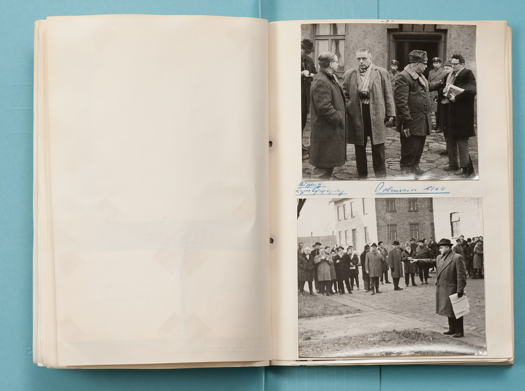 Im Dezember 1964 reiste eine Gruppe von Prozessbeteiligten unter der Leitung von RichterWalter Hotz nach Auschwitz, um das Lager »in Augenschein zu nehmen«. Anhand von ortsspezifischen Fragen, die das Gericht zusammengestellt hatte, sollten die Zeugenaussagen 20 Jahre nach dem Tatgeschehen geprüft werden. Erster Staatsanwalt Hanns Grossmann, der Leiter der zuständigen Abteilung bei der Staatsanwaltschaft Frankfurt am Main, dokumentierte die Reise mit Fotos und aufgesammelten Objekten vom Lagergelände und stellte sie in einem privaten Bericht in dreifacher Ausfertigung zusammen.