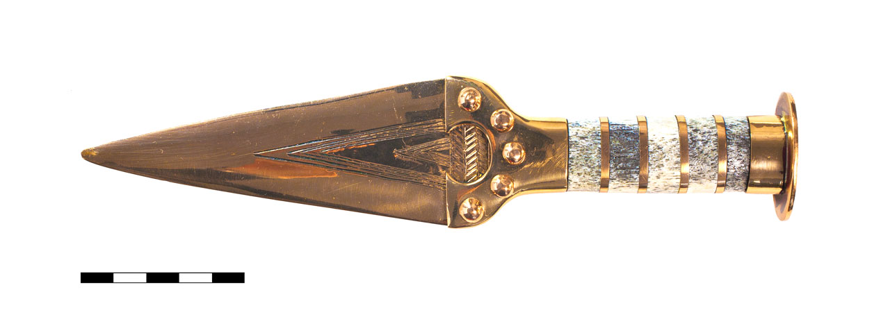 Der hier besprochene Dolch liegt als komplettes Replikat vor, daneben gehört aber auch sein Griff ohne die organischen Komponenten und Nieten zur Sammlung. An diesem Stück kann ganz besonders gut die Konstruktionsart der Griffe von Dolchen des sogenannten Alpinen Typs (früher Schweizer Typ) erläutert werden. Für die Zuordnung zu diesem Typ ist zunächst die Identifikation als Dolch grundlegend. Ein weiteres wichtiges Kriterium ist die Konstruktion des Griffs, der aus mehreren Materialien zusammengesetzt ist. In diesem Fall besteht er aus Geweih und Bronze. Einen solchen Griff bezeichnet man als Kompositgriff (lat. compositio - dt. Zusammenstellung, Zusammensetzung). Bei vorliegendem Exemplar wurden auf die Griffsäule abwechselnd Scheiben aus Geweih und aus Bronze oder Kupfer gesteckt. Anschließend wurde der Knauf aufgesetzt und befes- tigt. Diese besonderen Griffe sind das sogenannte diagnostische Merkmal, um einen Dolch dem Alpinen Typ zuzuordnen, der seinen Namen wegen des Verbreitungsgebiets vor allem in den Westalpen erhalten hat. Wie sind nun Griff und Klinge miteinander verbunden? Diese bilden durch Nieten eine Einheit, wie man sofort erkennen kann. Doch nicht bei allen handelt es sich auch tatsächlich um Nieten. Nur die beiden äußeren der fünf erkennbaren Erhebungen sind auch wirklich Nieten. Die drei inneren Erhebungen sind hingegen sogenannte Scheinnieten, die ausschließlich zur Verzierung des Griffs dienen. Ebenso verhält es sich bei der Dekoration der Klinge: Der länglich-ovale Heftausschnitt ist fast komplett mit einem Fischgrätmuster ausgefüllt und unterhalb des Heftausschnitts schließen sich zwei hängende Dreiecke aus jeweils vier Linien an.