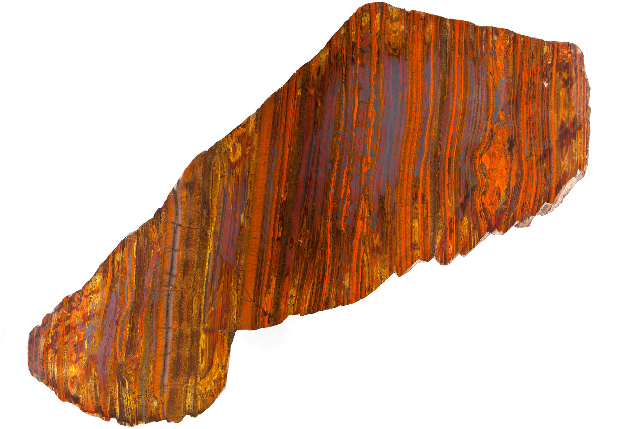 Die bedeutendsten Überlieferungen dieses erdgeschichtlichen Wandels, die bis heute von ihm erzählen, stellen die Bändereisenerze (Banded Iron Formation=BIF) dar. Es handelt sich dabei um Sedimente, welche aus dem Meerwasser ausgefällt und auf dem Meeresboden abgelagert wurden. Das vorliegende BIF-Handstück ist durch einen streifenartigen Farbwechsel von hellrot zu dunkelrot-braun gekennzeichnet. Dieses charakteristische Farbmuster der BIFs beruht auf einem rhythmischen Ablagerungswechsel von eisenhaltigen Lagen (dunkel) und kieseligen Sedimentschichten (hell). Diese Schichten, aufgrund derer das Gestein den Namen „Bändereisenerze“ erhielt, sind meist nur wenige Millimeter bis Zentimeter mächtig. Altersbestimmungen haben ergeben, dass deren Ablagerungen vom späten Archaikum bis in das mittlere Proterozoikum reichen, also zwischen 2,5 und 1,6 Milliarden Jahre alt sind. Durch vielfache Wiederholung der Bänderungen können die BIFs eine Mächtigkeit von bis zu 600 Metern erlangen. Sie stellen die wirtschaftlich bedeutendsten Eisenerzlagerstätten der Erde dar, die für unsere heutige Stahlindustrie unerlässlich sind. Ohne BIFs würde unser alltägliches Leben stark beeinträchtigt sein – beispielsweise würde es keine Autos oder Waschmaschinen geben.