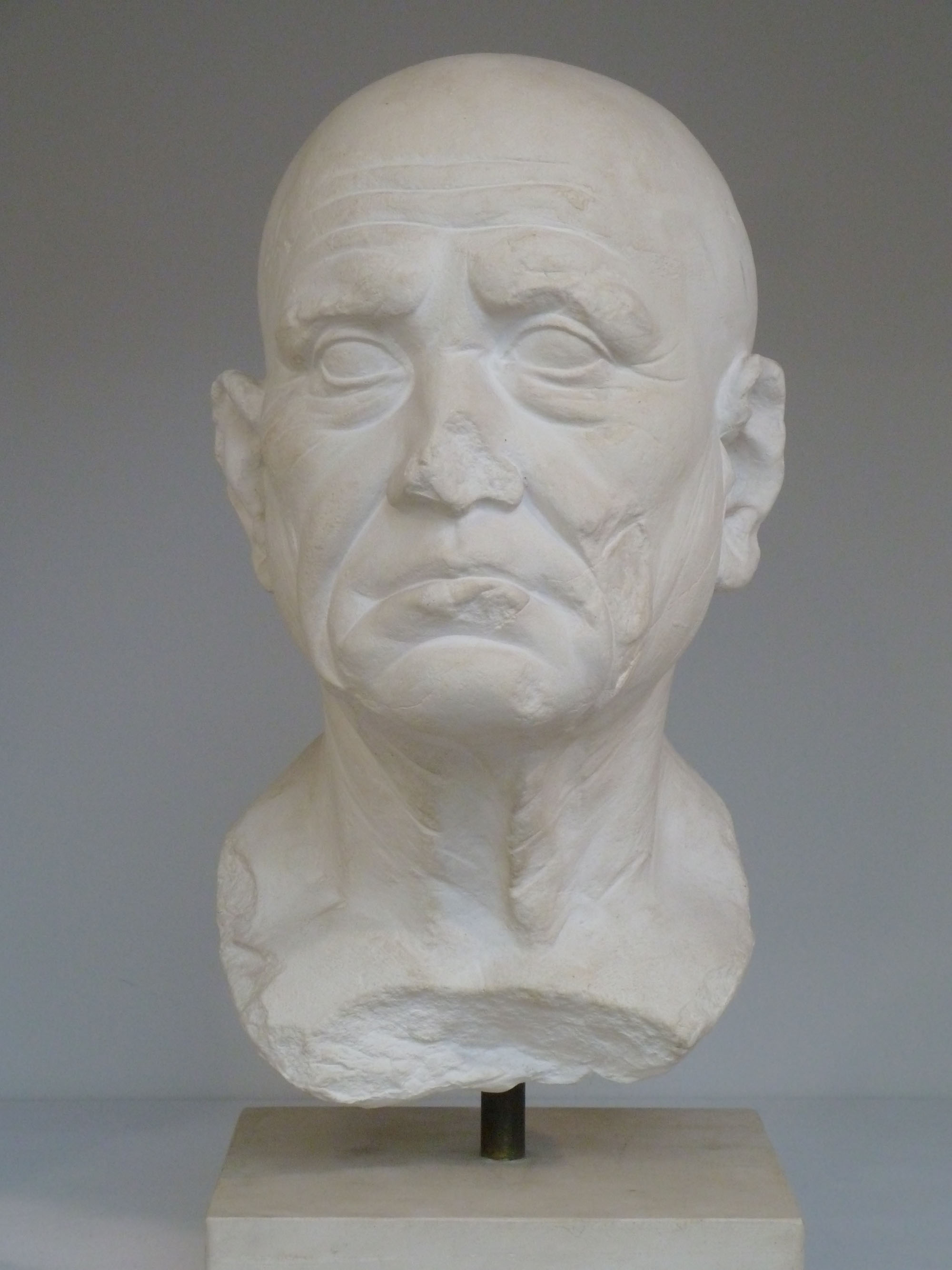 Dieser Kopf eines Römers aus spätrepublikanischer Zeit ist der Abguss eines Einsatzkopfes einer Statue, der im Antikenmuseum in Basel aufbewahrt wird. Das oval geschnittene Gesicht ist mit starken und tiefen Falten übersät, der Blick wirkt intensiv, schwer und nachdenklich. Entgegen der verbreiteten Meinung sind veristische Gesichtszüge in der römischen Portraitplastik nicht schlichtweg die authentischen Züge der dargestellten Person, wenngleich der Anspruch bestand, dass diese zu identifizieren sein sollte. So müssen einmalige charakteristische Merkmale der Person in die Gestaltung des Porträts eingeflossen sein, z. B. die Schädel- oder Nasenform. Die Mimik und die Altersmerkmale eines Portraitkopfes drücken hingegen physische und moralische Eigenschaften aus, wie sie vom Amt, der Familienzugehörigkeit, der sozialen Herkunft und sogar gesellschaftlichen Stellung der dargestellten Person erwartetet wurden. Bereits in der griechischen Porträtkunst wurden unterschiedliche mimische Schemata entwickelt, die bestimmte Typen psychischer Energien zu charakterisieren geeignet waren: Es existieren jeweils spezielle Kombinationen von Blick und Stirnfalten für denkpotente Philosophen sowie für entscheidungs- und handlungsstarke Feldherrn. Gehörte im Griechischen ungebrochene körperliche Vitalität, ja sogar Schönheit zum Gesichtstypus der politischen Eliten, so findet sich im spätrepublikanischen, ‚gerontokratischen‘ Rom ein geradezu gegenteilig zu nennender Typus: hohle Wangen, faltenzerfurchtes, eingetrocknetes Inkarnat als Ausweis von Alterserfahrung und zehrender Sorge um den Staat, aber auch von Askese und autoritärer Härte, die in zusammengepressten schmalen Lippen und herabgezogenen Mundwinkeln auch mimisch ausgebaut wurden.