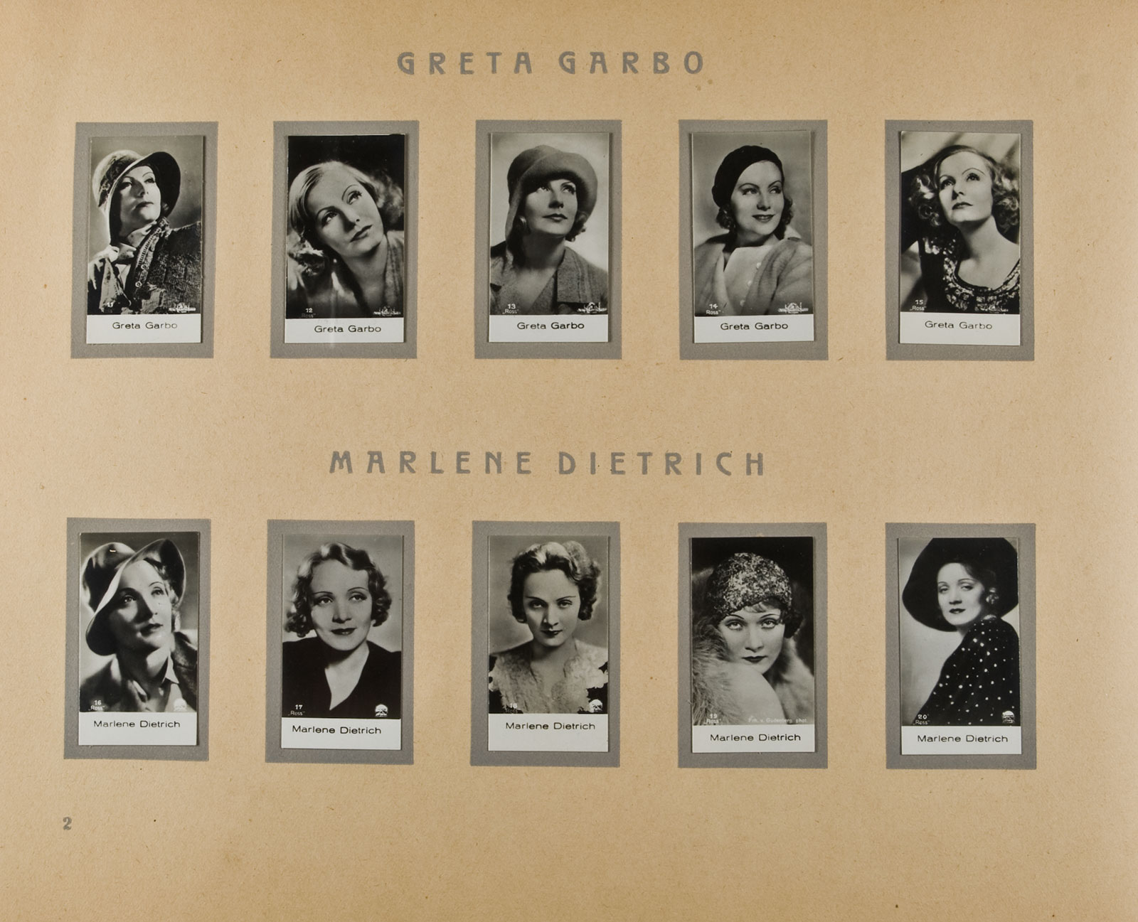 In den 1920er-Jahren stieg die Zigarettenindustrie in die Sammelbildproduktion ein und legte ihren Packungen zur Kundenbindung Bilder bei, die neben Nationalfahnen und Sportler/-innen insbesondere Porträts von Schauspieler/- innen zeigten – einige von ihnen auch rauchend. In bis zu 200-teiligen Bildserien reiht sich ein Porträt neben das nächste. Marlene Dietrich (1901 – 1992) taucht ebenso wie Greta Garbo (1905 – 1990) in jedem der Alben auf – meist sogar mehrfach. Im Nebeneinander der unterschiedlichen Gesichter lesen sich die Alben heute auch wie ein Katalog der damaligen Kleidungs- und Rauchstile.