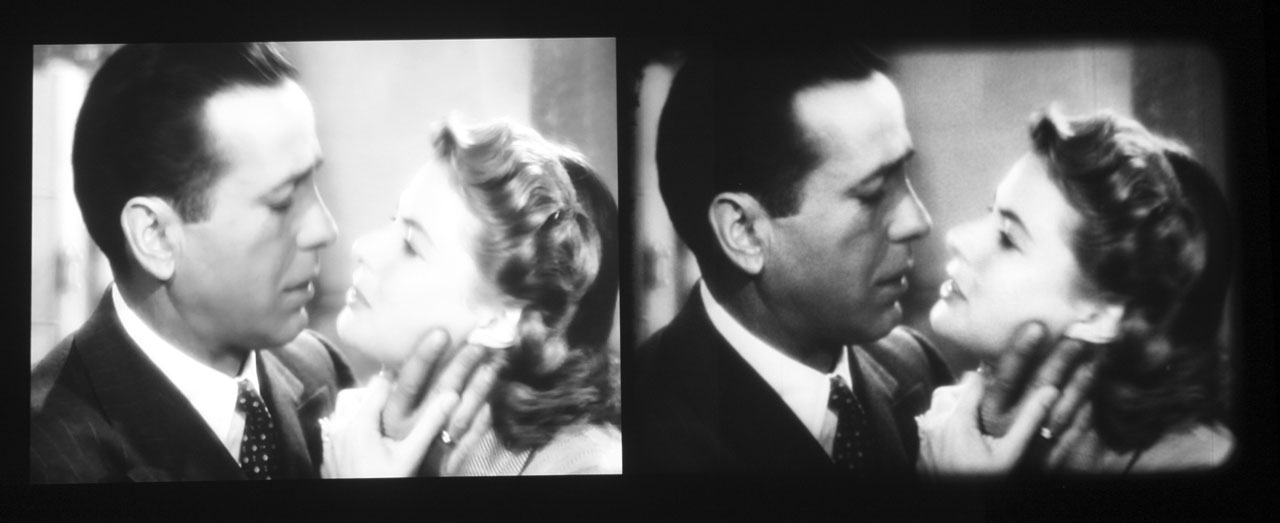 Werkgetreu verhält sich hingegen die – bis auf das weggeschnittene Start- und Endlogo sowie einige Sekundenbruchteile früher abblendende Szenen – nahezu vollständige schwarz-weiße Frankfurter Schmalfilmkopie. Wenn Bogart und Bergman zu „Perfidia“ tanzen, scheint alles zu stimmen. In kontrastreichem, scharf gestochenem Schwarz-Weiß gleiten die Körper zu Alberto Domínguez’ Song über die Tanzfläche, auf der sich, wie feine helle Tupfer, die Reflexionen der Lichter der Discokugel abzeichnen. Das Filmformat zeigt seinen vollen Glanz auch, wenn wir die Protagonistin in Naheinstellungen zu Gesicht bekommen: In Bergmans Frisur lassen sich selbst in der reduzierten Schmalfilmkopie einzelne Strähnen erkennen, während ihr Haar auf Digitalisaten des Films zu einem Schopf verschmilzt; selbst die Stofflichkeit der Kleider ist auf der nur selten vorgeführten und daher wenig abgenutzten Frankfurter 16mm-Kopie noch wunderbar erhalten, während eine DVD allenfalls erahnen lässt, welches Kostüm die Bergman trägt.