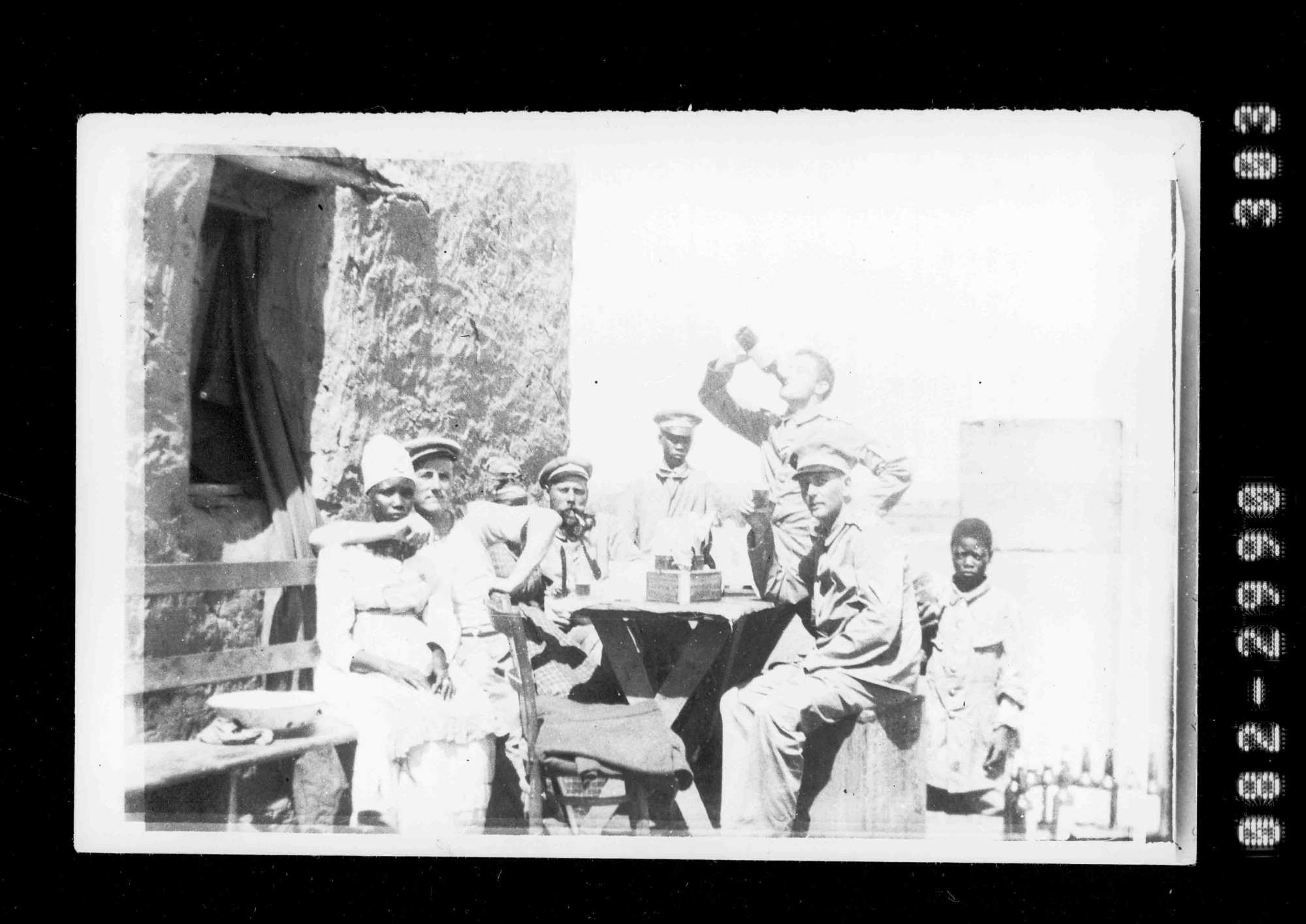 Über den spärlichen Text auf der Rückseite des Fotos erfahren wir einige Informationen über den Entstehungskontext; „Der 27ten Januar 1905 in Otjosazu. Von Links aus gesehen: Sgt. Siek mit seiner Frau Victoria, Feldwebel Peters, Ludwig, Unteroffizier Tom, Anton, Unteroffz Bantz“. Außerdem ist auf der Fotohülle vermerkt, dass das Foto auf der „2. Etappe“ der Reise des deutschen Fotografen Jean Bantz entstand, der auf der rechten Bank sitzt. Unteroffizier Bantz ist als Fotograph der insgesamt 450 Bilder, die Teil des Kolonialen Bildarchivs an der Universitätsbibliothek Frankfurt befinden, angegeben. Er schaut wie die meisten Personen auf dem Bild direkt in die Kamera und hat ein Glas angehoben, als würde er einen Trinkspruch ausbringen wollen.