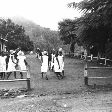Betrachtet man das Foto genauer, sieht man an der Wand eines Hauses zwei schwarze Frauen und zwei weiße Männer, auf einer Holzbank in der Sonne sitzend. Der Mann in der Mitte hat einen Arm um die Schulter der einen Frau gelegt, die allem Anschein nach schwanger ist. Rechts und links im Hintergrund stehen zwei Schwarze, welche offenbar nicht zur trinkenden Gesellschaft gehören und namenlos bleiben. Rechts, ein kleiner Junge, der dem uniformiert wirkenden Schwarzen Mann links gerade Mal bis zur Hüfte reicht. Durch sein zu großes Hemd und seine Arme, die fast bis zum Boden reichen, wirkt der Junge kleiner als er in der Realität sein muss.