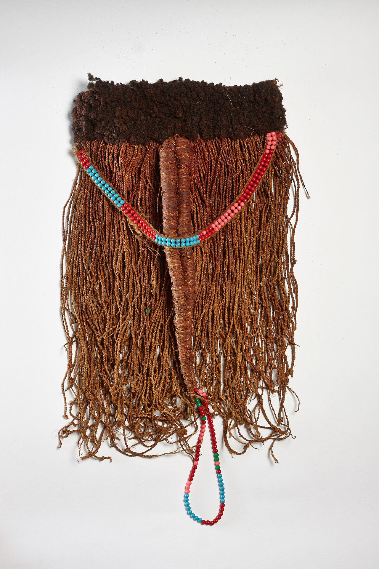 Es gab also verschiedene Gründe, die Haartracht aufzugeben. Die Kxoé-Frauen rea- gierten jedenfalls darauf, indem sie anfingen, die »dìcúpèká«-Perücke zu fertigen. Dabei wurden die »l’ê«-Strähnen an einem circa 15 Zentimeter breiten und 30 Zentimeter langen Band aus Fell befestigt. Der breite Streifen Fell imitierte das Haupthaar. Die dünnen geflochtenen Strähnen bildeten das lange Haar, in das kleine Muscheln eingeflochten wurden. Aus Schnüren und Fell entstanden so Haartrachten, die selbstbewusst am Wohnplatz getragen werden konnten, während man beispielsweise zum Gottesdienst mit geschorenem Haar kam.