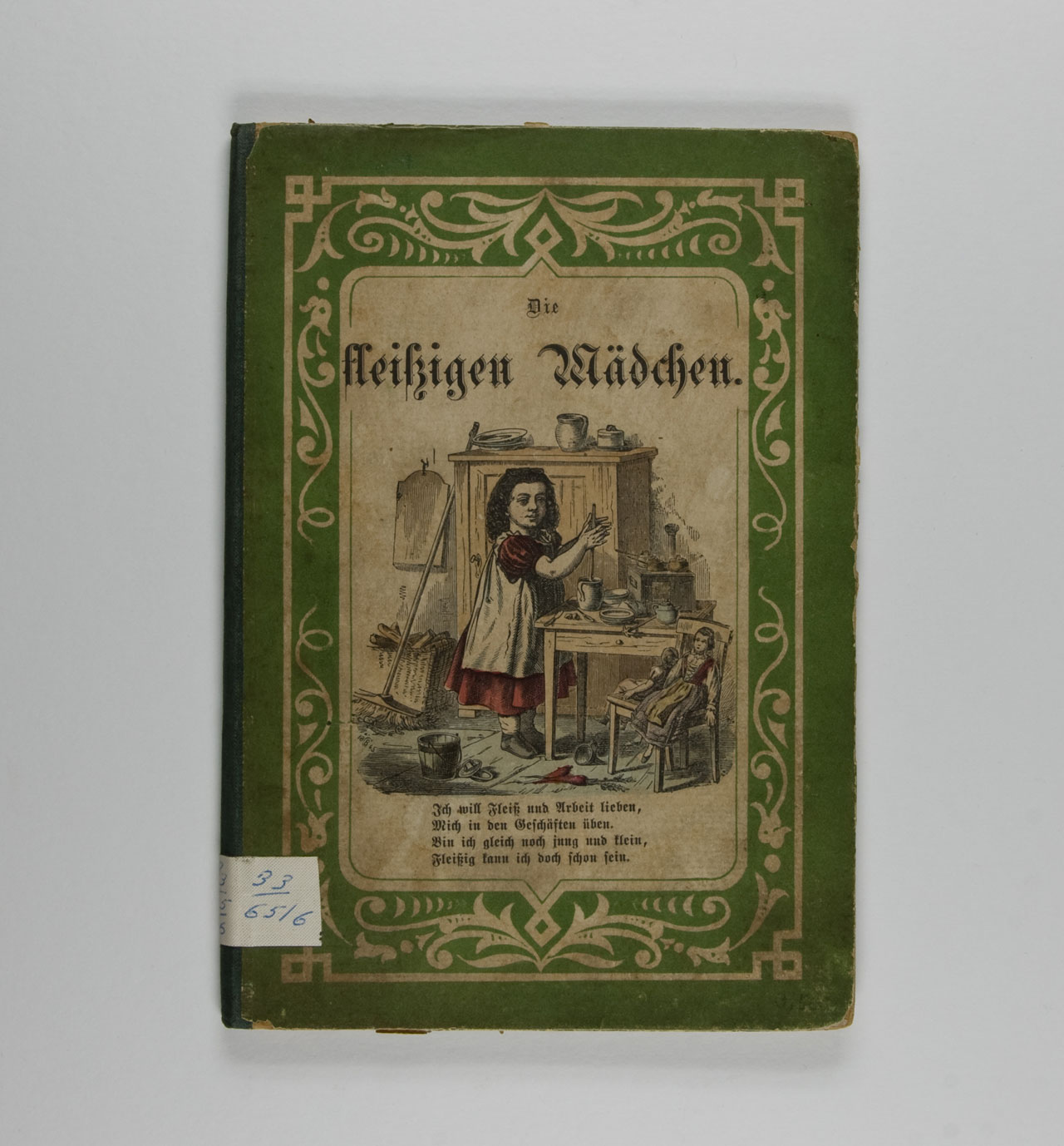 »Bin ich gleich noch jung und klein, fleißig kann ich doch schon sein.« Das sind die Worte eines Mädchens mit schwarzem lockigem Haar. Anstatt mit ihren Puppen zu spielen, steht die kleine Köchin in der Küche, wo sie – getreu ihrer Aussage – tüchtig rührt und quirlt. Als farbige Illustration ziert sie die Titelseite des Bilderbuchs Die fleißigen Mädchen. Ein Bilderbuch für die kleinste Damenwelt aus dem Jahr 1865. Auf 24 Seiten zeigen sie und ihre Kameradinnen der Leserin, dass Fähigkeiten in der Hausarbeit wichtige Voraussetzungen sind, um eine anständige Dame zu werden. So begegnet man beim Durchblättern dieses Büchleins kleinen Gärtnerinnen, Waschfräulein am Zuber und eifrigen Schneiderinnen. Neben den Tätigkeiten im Haushalt sollen aber auch die intellektuelle Bildung oder das Klavierspiel nicht vernachlässigt werden. Mit einem belehrenden Reim zu jeder Illustration ist die Intention dieses Bilderbuchs eindeutig zu erkennen: Den Mädchen soll eine klare Vorstellung von Anstand und Moral vermittelt werden.