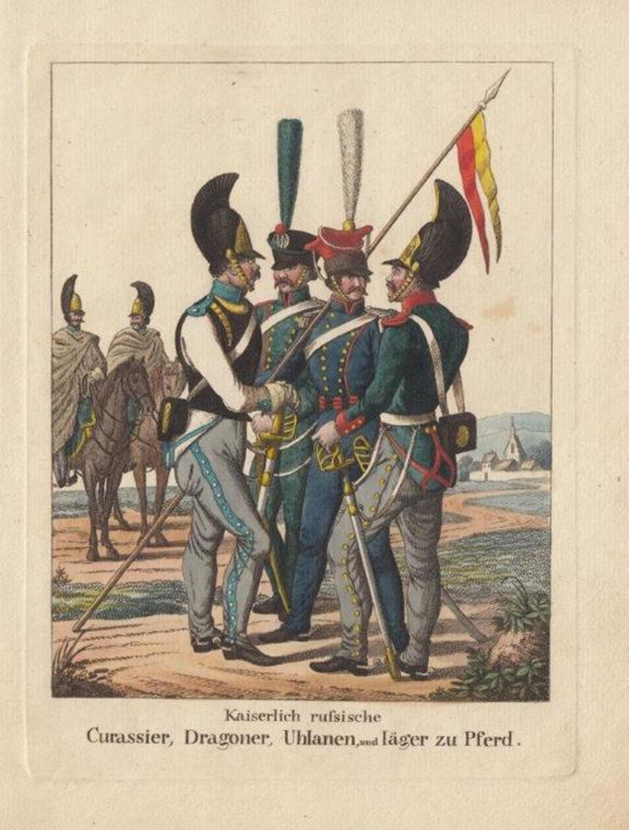 Das in vier monatlichen Lieferungen erschienene Werk beschreibt neben Organisation und Ausrüstung der Russischen Armee besonders eindrucksvoll die Härte des militärischen Alltags: „Die Rekruten werden aus dem ganzen Reich nach den Depots abgeführt. […] Weit, oft tausend Meilen von der Heimath entfernt, hat der Soldat dann 25 lange Jahre [!] im Kriegsdienst zu durchleben, ehe ihm die Hoffnung zur Rückkehr wird. Kein Urlaub versüßet ihm die lange Trennung. […] Das Ausheben der Rekruten geschieht durch das Loos, wen es trifft, ledig oder verheurathet, der ist Soldat.“ (S. 8/9) Die idealisierte Darstellung einzelner Truppenteile auf den acht Kupferstichen in prächtigem Kolorit steht im Gegensatz zu den im Text beschriebenen Entbehrungen.
