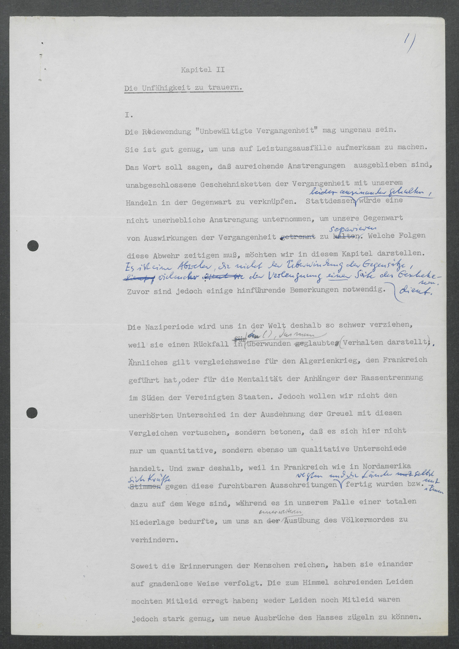 Das Frankfurter Psychoanalytikerpaar Alexander Mitscherlich (1908 – 1982) und Margarete Mitscherlich-Nielsen (1917–2012) veröffentlichte 1967 einen Schlüsseltext zur Bewältigung der nationalsozialistischen Vergangenheit. Mithilfe psychoanalytischer Kategorien suchten die Wissenschaftler eine Erklärung für die Entstehung und Ausbreitung des Rassenwahns und die Etablierung eines blinden Gefolgschaftssystems. Insbesondere analysierten sie den Umgang mit der kollektiven Schuld nach dem Zusammenbruch des Dritten Reichs. Sie diagnostizierten ein Ausbleiben einer nennenswerten gesellschaftlichen Trauerreaktion und die Unfähigkeit, sich in das Leid und die Qualen der verfolgten Mitbürger einzufühlen. Als Ursache sahen sie die starke Identifizierung der Hitleranhänger mit dem als omnipotent fantasierten Führer, dessen Selbstmord einem Trauma gleichgekommen sei. Dieses habe zu einer Derealisierung und Leugnung der Vergangenheit geführt.