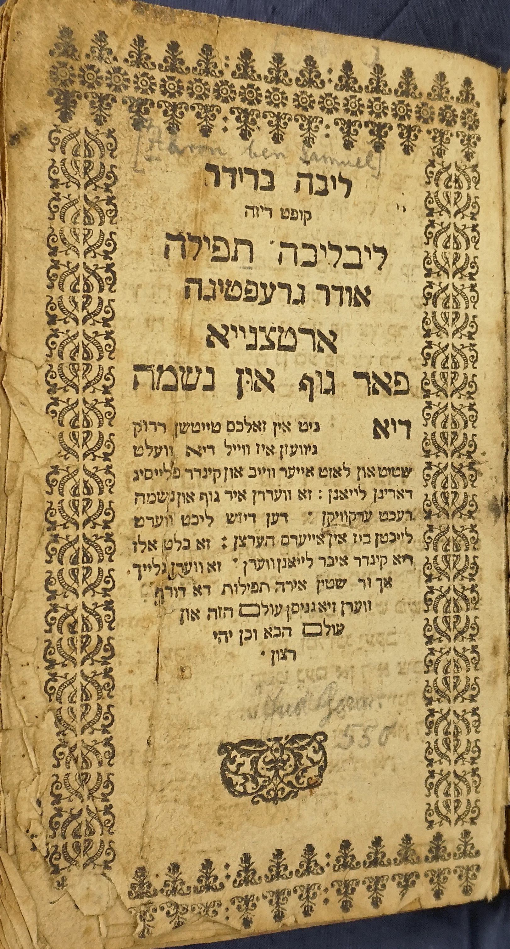 Liblikheh tfileh is a compilation of prayers partially based on the Siddur of psalms and private devotions, some of which explicitly were written for women. The author, Aaron ben Samuel of Hergershausen (1665–c. 1732), explores his intentions in an elaborate preface. He strongly recommended teaching children the prayers in their native language, Yiddish. He argued that this method would help children to familiarize themselves more easily with the Hebrew language and thus the message of the prayers. The book opens with a table of Hebrew alphabet serving as an reading-aid. Hengernhausen's didactical approach responded to an, in his eyes, outdated educational system. According to Rebekka Voß, Hegershausen was the first jewish pietist and one of the first who acknowledged that the desired renewal can only be achieved through knowledge (Voß, 731-763). His Tkhines were a means to an end, the reformation of a religious system which was not compatible with the everyday situation of the rural Jewish communities. Hegershausen saw not only the need to change the education of children but also to empower women. Moreover, the translation was a product of interreligious exchange between christian pietists and missionaries (who were writing in Yiddish, too) and Jewish authors like Hergershausen. The book was printed in Amsterdam, Prague and Frankfurt an der Oder from the middle of the 17th century until the first years of the 18th century. The University Library Frankfurt holds the first edition, of which previous owners included David Michael Würzburger (geb. 1690) and Rabbi Nehemias Brüll (1843–1891). In 1892, the Stadtbibliothek Frankfurt was able to acquire Brülls Library through generous donations from the Frankfurt Jewish community.Originally this text was published as part of the online exhibition Jewish Books & Jewish Collections: Treasures of the University Library Frankfurt on the occasion of the 12th Congress of the European Association for Jewish Studies at Goethe University Frankfurt, July 2023.