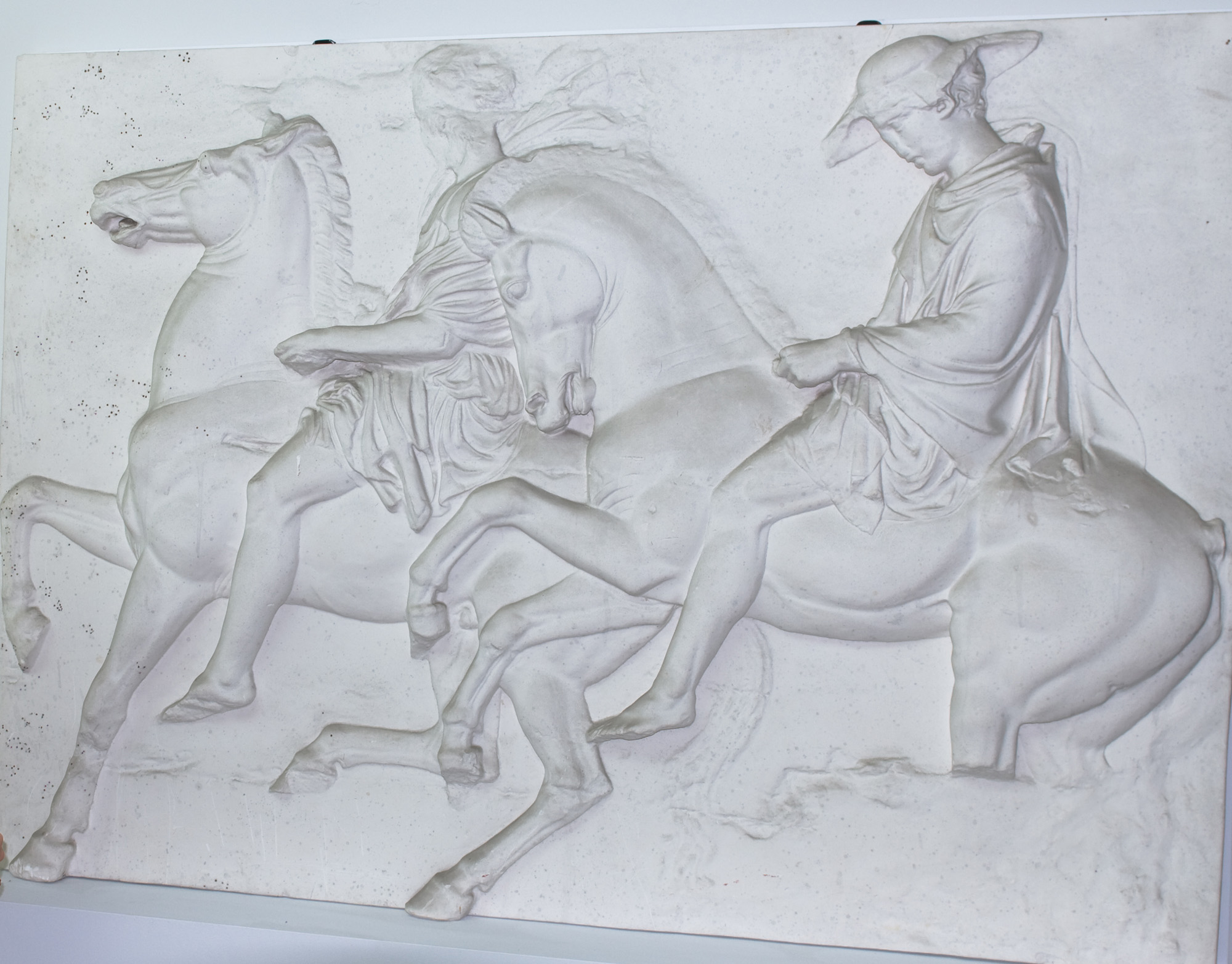 Die beschriebene Szene ziert eine langrechteckige Reliefplatte aus weißem Gips. Die Reiter und ihre Pferde nehmen die gesamte Länge und Höhe der Platte ein, der restliche Reliefgrund ist eben und leer. Trotz der geringen Relieftiefe von wenigen Zentimetern, zeichnet sich die Szene durch Raumtiefe und Körperhaftigkeit aus. Die Darstellungen wirken naturbezogen und sind detailreich. Das Relief ist nicht mehr vollständig erhalten; so fehlen der Kopf des linken Reiters, die Hinterbeine des rechten Pferdes sowie beide Schweife der Tiere. Die Umrisse der fehlenden Partien sind aber noch auf dem Reliefgrund zu erkennen. Als Abguss steht die Platte stellvertretend für ein Relief des größten Tempels auf der Akropolis des antiken Athens: des Parthenon. Im 5. Jh. v. Chr. erbaut zierte dieses, angebracht in über 10 Metern Höhe und mit einer Gesamtlänge von 160 Metern, alle vier Seiten des Kernbaues. In der Archäologie viel diskutiert, zeigt es wohl einen großen Festumzug anlässlich einer jährlich stattfindenden Kultfeier zu Ehren der Stadtgöttin Athena, in dem sich allerlei Athener tummeln, darunter auch mehr als 100 Reiter zu Pferde. Der Parthenon, eines der besterhaltenen Monumente der antiken Welt, ist für die Vermittlung der antiken Architektur und Kunst in der Lehre der klassischen Archäologie von zentraler Bedeutung.