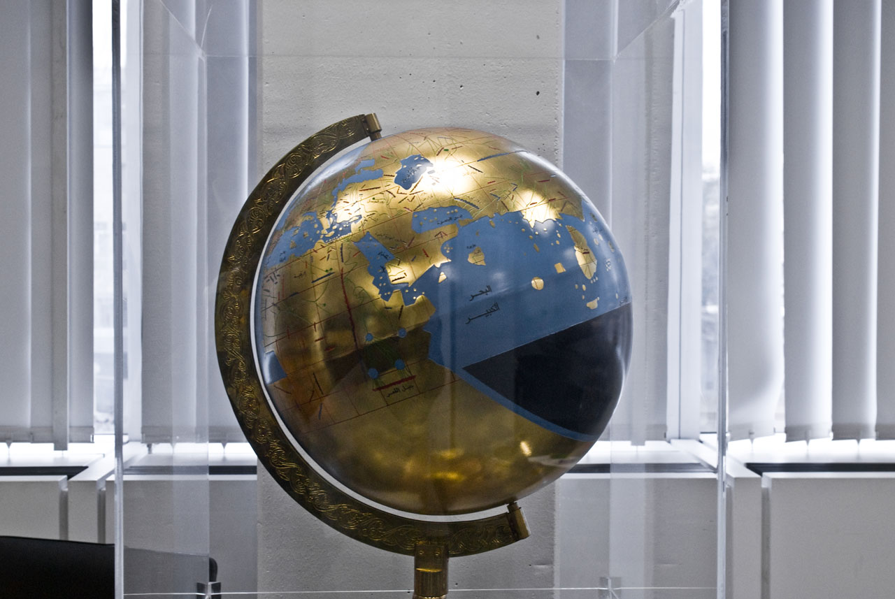 Jedem Besucher des Lesesaals im Universitätsarchiv Frankfurt muss der fast mannshohe Globus auffallen, der dort in einer Vitrine ausgestellt ist. Doch bei genauerer Betrachtung wird er sich wundern: Was ihm der Globus zeigt, entspricht nicht unserer Vorstellung von der Erde. Das Mittelmeer ist recht leicht zu identifizieren, doch je weiter man den Blick nach Osten und Süden wandern lässt, desto merkwürdiger erscheinen die Formen der Kontinente: Afrika nimmt fast die Hälfte der Südhalbkugel ein und wird im Westen und Osten von geraden Linien begrenzt, Amerika und Australien fehlen ganz, und mitten durch das, was man als Indischen Ozean verstehen könnte, verläuft eine gerade Trennlinie zwischen hell- und dunkelblauem Wasser. Will man sich zur Identifikation der Meere und Länder der Beschriftungen bedienen, stellt man fest: sie sind auf Arabisch.