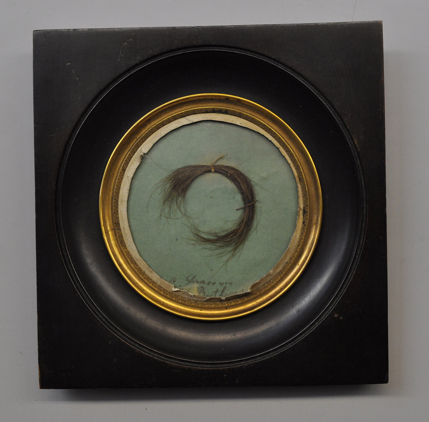 Im 19. und beginnenden 20. Jahrhundert kam es zu einer fast kultischen Verehrung von Musikern, Komponisten und Schauspielern, die sich in einem regen Handel mit Künstlerandenken niederschlug. DerWunsch, möglichst persönliche Gegenstände insbesondere verstorbener Künstler zu ergattern, zeigt sich auch an der Haarlocke Ludwig van Beethovens (1770 – 1827) aus der Sammlung des FrankfurterWeinhändlers Friedrich Nicolas Manskopf (1869 – 1928). Deutschlandweit finden sich in mehreren Sammlungen vermeintlich echte Locken des Komponisten – darunter auch welche, die ihm angeblich heimlich nach seinem Tod abgeschnitten wurden. Das in der Universitätsbibliothek verwahrte Exemplar könnte tatsächlich authentisch sein; vermutlich gelangte es aus dem Nachlass von Beethovens Sekretär und Biografen Anton Schindler (1795 – 1864), der seine letzten Jahre in Frankfurt- Bockenheim verbrachte, in Manskopfs Museum.