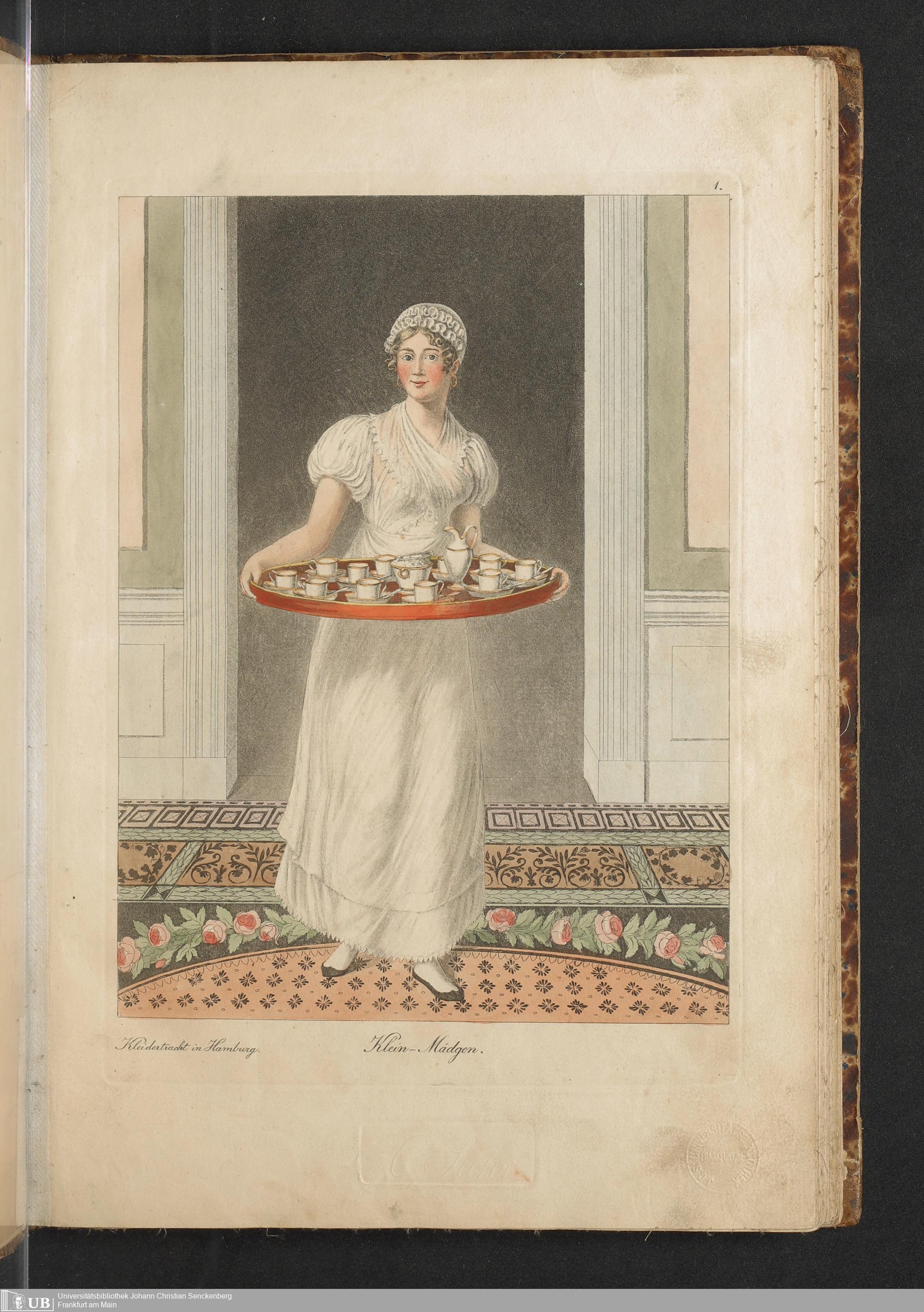 Das prachtvolle Hamburger Trachtenwerk liegt hier in der dritten und seltensten Ausgabe der erstmals 1808 erschienenen Folge vor. Gezeigt werden Aquatinta-Radierungen in leuchtendem Altkolorit verschiedener Trachten und Berufe, darunter Dienstmädchen, Näherinnen, Ammen, Köchinnen, Blankeneser Fischverkäuferinnen, Vierländer Bauern, Milchmann, Zuckerbäcker, Bierfahrer, Altenländerinnen, Helgoländer, die Senatsgarde, sowie die bekannte Darstellung einer Alsterschifffahrt und einer Schlittenfahrt auf der zugefrorenen Elbe, wobei besonders die beiden letzteren inzwischen zu Hamburgensien-Ikonen geworden sind. Sämtliche Tafeln sind mit dem Trockenstempel des Künstlers im unteren weißen Rand versehen.