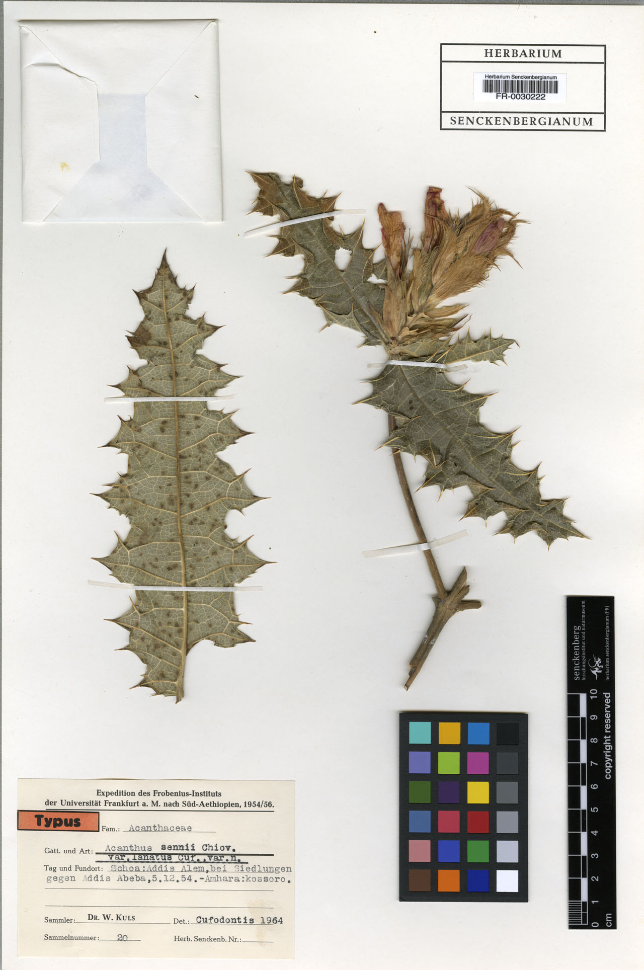 Die weitere Beschriftung verrät, dass die hier bestimmte Pflanze auf der „Expedition des Frobenius-Instituts der Universität Frankfurt a. M. nach Süd-Aethiopien, 1954/56“ gesammelt wurde. Das Frobenius-Institut, Deutschlands ältestes Institut für ethnologische, historische und prähistorische Studien, legt seinen Schwerpunkt auf Afrika-Forschung. Der angegebene Sammler, Wolfgang Kuls (1920–2002), Botaniker und Geograph und selbst nicht Mitglied des Institutes, begleitete 1954 die Expedition nach Südäthiopien. Vor Ort widmete er sich für seine humangeographischen Studien besonders den Kultur- und den genutzten Wildpflanzen, das gesammelte Material wertete er jedoch nicht selbst aus. Erst zehn Jahre später begann Professor Georg Cufodontis (1896–1974) in Wien mit der systematischen Benennung der Fundstücke. Im Beleg mit der Sammelnummer 20 aus Addis Alem, damals Teil des ägyptischen Königreichs Schoa, erkannte der Biologe eine Akanthuspflanze.