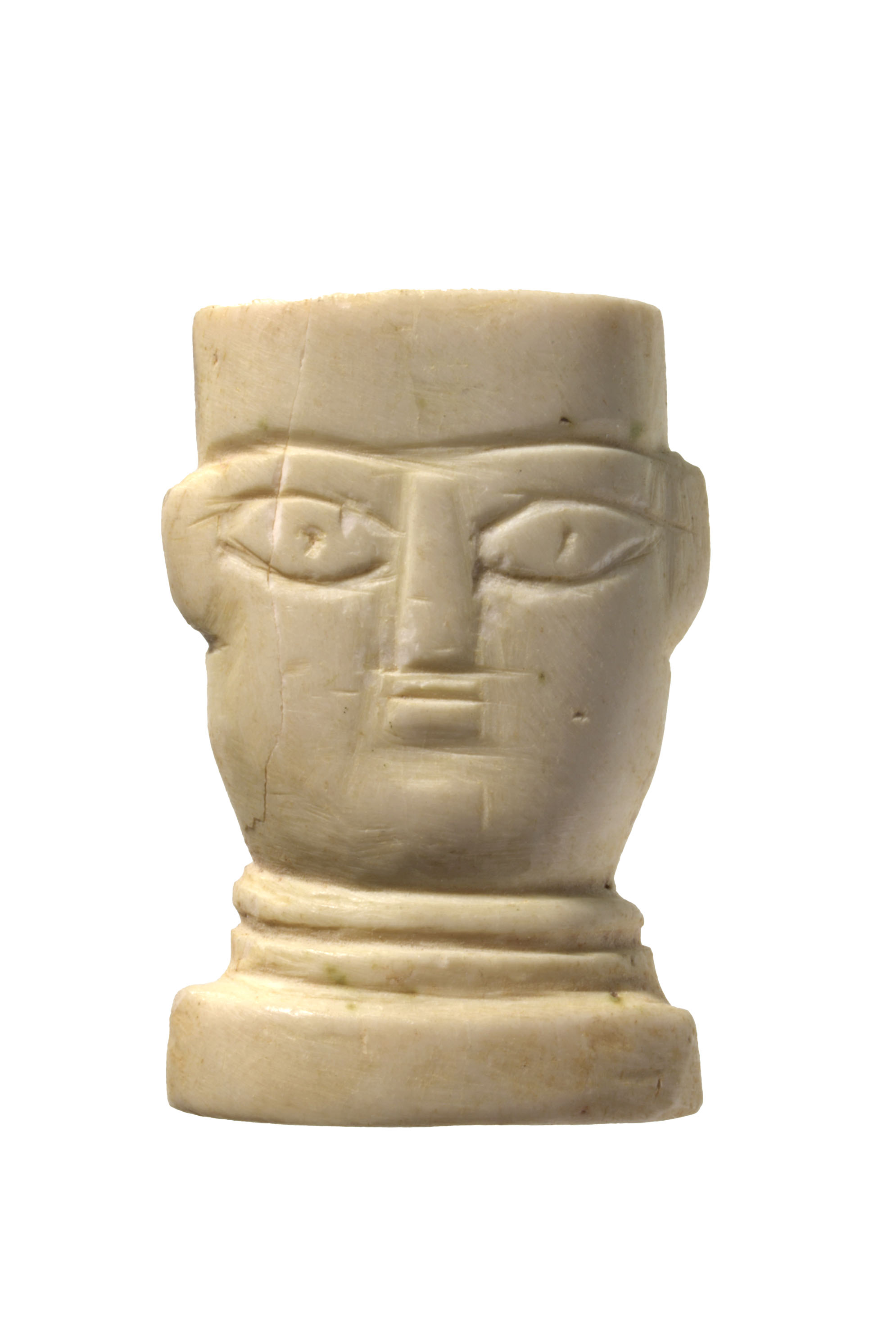 Aus dem hellenistischen Ägypten stammt ein kleines Intarsienköpfchen aus Knochen. In der Rückansicht ist die schwammartige Struktur des Knochens (Spongiosa) deutlich zu erkennen. Die eher grob geschnitzte Vorderseite zeigt ein geschlechtsneutrales Gesicht mit kleinem Mund und gerader Nase sowie lappenartigen Ohren. Das oben und unten gerade geschnittene Köpfchen war vermutlich als Einlage für eine Puppe vorgesehen, wie sie m spatantiker Zeit im östlichen Mittelmeerraum weit verbreitet waren.