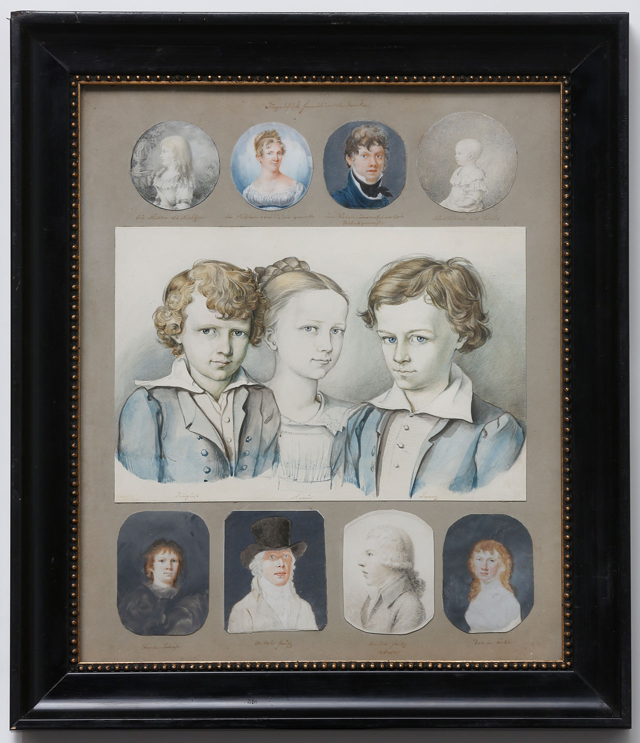 Eine eigene kleine »Familien-Serie« bildet das Blatt aus der Kunstsammlung, auf das neun einzelne Zeichnungen aufgeklebt sind. Diese zeigen verschiedene Mitglieder einer Familie des Frankfurter Bürgertums im 19. Jahrhundert, der Familie Jügel, die zu den wichtigsten Stiftern der Frankfurter Universität gehörte. Die in der Mitte dargestellten Brüder Friedrich Martin August Jügel (1818 – 1880) und Carl Franz Jügel (1821 – 1901) vermachten der Stadt Frankfurt ihr Vermögen – zum Andenken ihres Vaters, des Verlegers Carl Christian Jügel (1783 – 1869). Die daraus entstandene Stiftung hatte die »Einrichtung und Unterhaltung einer allgemeinen öffentlichen Akademischen Unterrichtsanstalt für die Gebiete der Geschichte, der Philosophie und der deutschen Sprache sowie Literatur« zum Ziel. Aus dem Stiftungsvermögen konnte unter anderem das frühere Hauptgebäude der Universität errichtet werden, deshalb Jügelhaus genannt. Die teils kolorierten Porträts, die von unterschiedlichen Familienangehörigen selbst gezeichnet wurden, hatte offenbar ein Mitglied der Familie gesammelt und zu einem Gruppenbild zusammengestellt.