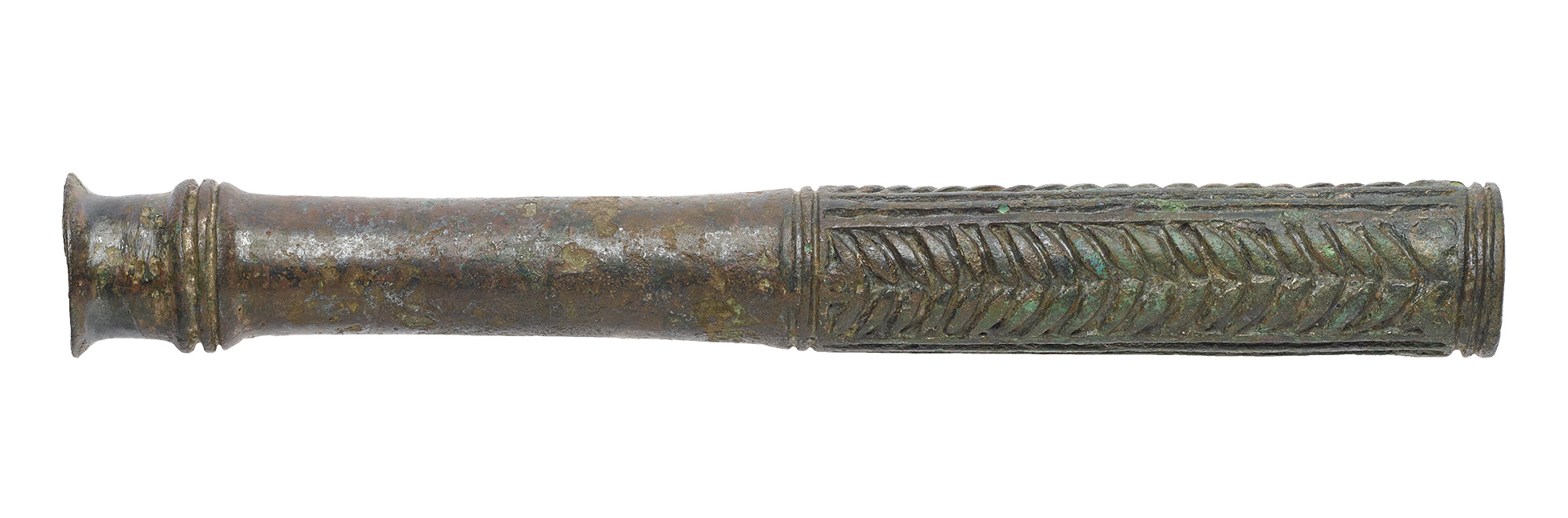 Zu den Bronzewaffen in der Altorientalischen Sammlung gehört dieser Keulenkopf mit Getreidekornverzierung. Es handelt sich hierbei um einen röhrenförmigen Keulenkopf mit durchgehendem Schaftloch, welcher mit der so genannten Getreidekornverzierung fischgrätartig versehen ist. Diese Gestaltungsart erhält ihren Namen durch die Ähnlichkeit mit Getreideähren. Der obere Teil des Keulenkopfes ist durch kleine, ovale und schräg zueinanderstehende Buckel gegliedert. Die Buckelfelder werden durch lineare Rippen voneinander getrennt sowie am oberen und unteren Ende durch jeweils eine umlaufende Rippe begrenzt. Der untere Teil des Keulenkopfes ist unverziert. Die Mündung des unteren Schaftlochs ist nach außen gebogen. Darüber verlaufen zwei aneinander liegende Rippen parallel zur Mündung.