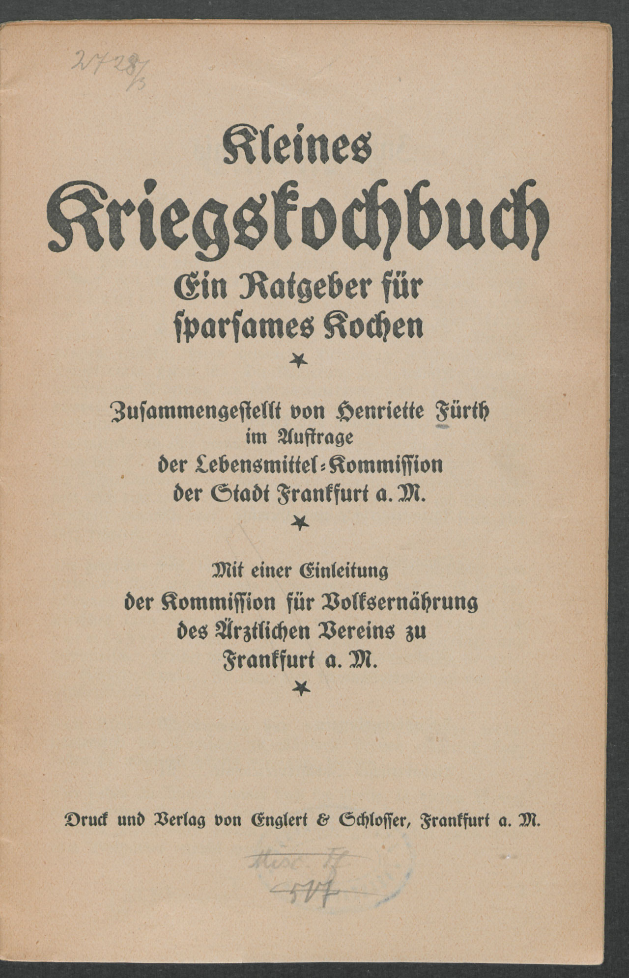 Das Kriegskochbuch von Henriette Fürth wurde kurz nach dem Ersten Weltkrieg in der Stadtbibliothek Frankfurt inventarisiert. Später wurde es der kleinen Kochbuch-Sammlung der Frankfurter Universitätsbibliothek zugeschlagen. Zu den knapp 2000 Titeln der Sammlung, die überwiegend nach 1950 erschienen sind, gehören nicht nur deutschsprachige, sondern auch französische sowie englische Kochbücher und Publikationen zu Gastronomie und Esskultur. Auch umfasst die Sammlung eine kleine Auswahl an exotischen Rezeptbüchern, zum Beispiel für afrikanische Gerichte. Seit einiger Zeit wird der Bestand durch eine zweite Kochbuchsammlung ergänzt (Signatur 40), die eine Dauerleihgabe der Tafelkultur-Stiftung ist.