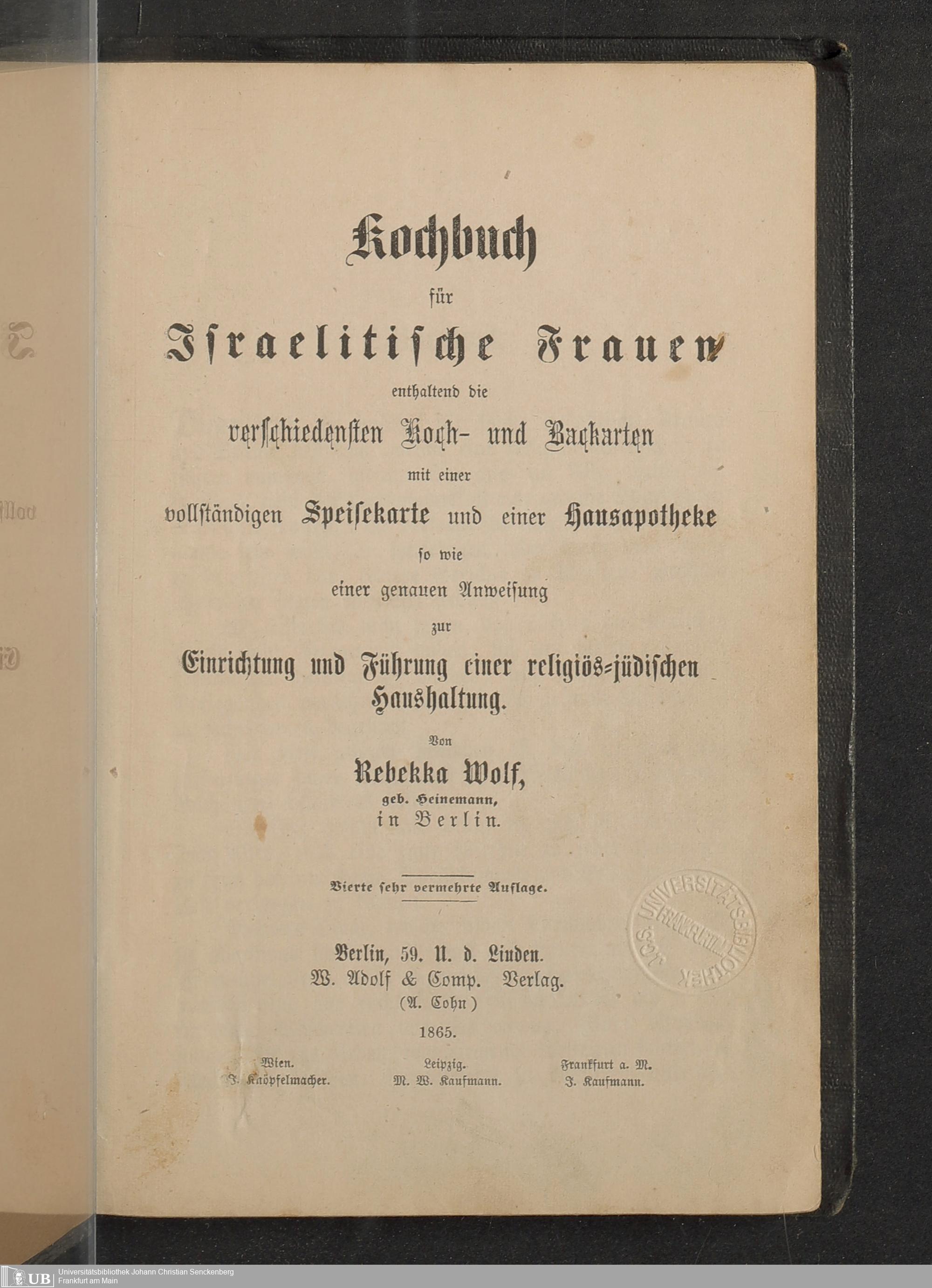 Die Hebraica- und Judaica-Sammlung der Universitätsbibliothek umfasst zahlreiche jüdische Kochbücher, darunter auch Rebekka Wolfs „Kochbuch für israelitische Frauen – enthaltend die verschiedensten Koch- und Backarten; mit einer vollständigen Speisekarte und einer Hausapotheke sowie einer genauen Anweisung zur Einrichtung und Führung einer religiös-jüdischen Haushaltung“ von 1865. Es ist das älteste Kochbuch der Sammlung, die seit Mitte des 19. Jahrhundert durch Schenkungen Frankfurter Jüdinnen und Juden entstand. Erstmals erschien die Rezepte-Sammlung 1851 und wurde mehrfach neu aufgelegt und erweitert. Bis 1933 erschienen 14 Auflagen.