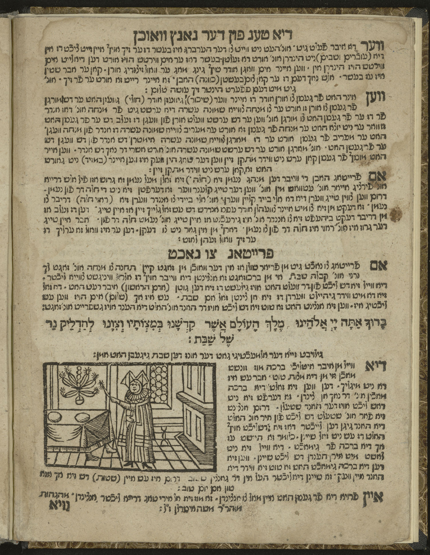 Das jüdische Leben wird durch die Ausübung der religiösen Gebote bestimmt, deren konkrete Umsetzung in den einzelnen Regionen oder Gemeinden über die Jahrhunderte eine eigene Prägung erhielt und zur Entwicklung zahlreicher unterschiedlicher religiöser Bräuche, Minhagim, führte. Ab dem Mittelalter kam es zu einer systematischen Sammlung und Verschriftlichung in Minhagim-Büchern, die auf eine Vereinheitlichung der Bräuche abzielten. Sie beschrieben detailliert die Abläufe der Feiertage und die verschiedenen rituellen Handlungen. Heute ermöglichen die Minhagim-Bücher einen sehr genauen Einblick in den jüdischen Alltag vergangener Jahrhunderte. Das bekannteste Werk dieser Art ist das des Rabbiners Isaak Tyrnau, das erstmals 1566 auf Hebräisch in Venedig erschien. Die erste gedruckte Ausgabe in jiddischer Übersetzung erschien 1590. Spätere Ausgaben wie diese 1722/23 in Frankfurt publizierte Fassung verwendeten Holzschnitte zur Illustration derwesentlichen Elemente der Bräuche und zur praktischen Anleitung. Die Abbildungen wurden in der Regel von Künstlern christlichen Glaubens erstellt, deren Unkenntnisse der jüdischen Gebote manchmal zu Ungenauigkeiten führten. So hat der dargestellte Chanukka-Leuchter nur sieben statt der üblichen neun Arme und ist eine Wiedergabe des siebenarmigen Leuchters im Tempel von Jerusalem.
