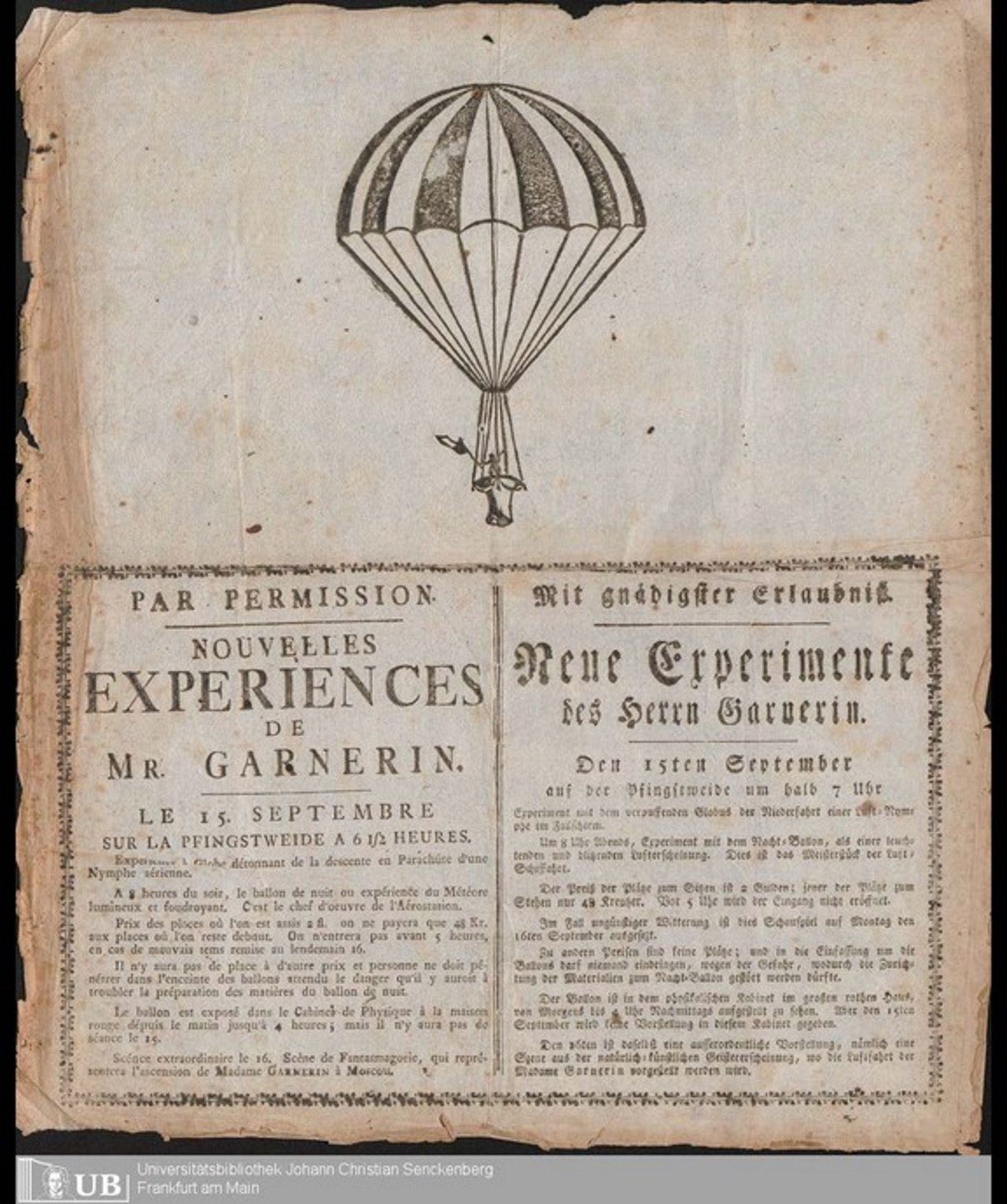 Der Einblattdruck, der wahrscheinlich auch als Plakat Verwendung fand, lädt für den 15. und 16. September 1805 zur Vorführung einer Ballonfahrt des französischen Luftfahrtpioniers André Jacques Garnerin (1769-1823) auf die Frankfurter Pfingstweide ein. Garnerin unternahm bereits 1790 seine erste Luftreise mit einem selbst konstruierten Heißluftballon. Anfang des 19. Jahrhunderts überwand er bereits Strecken von mehr als 300 km. Die Demonstration anlässlich der Frankfurter Herbstmesse im September 1805 war sein 39. Aufstieg. Garnerin gilt als Erfinder des rahmenlosen Fallschirms, mit dem er erstmals am 22. Oktober 1797 in Paris über dem Parc Monceau absprang. Seine Ehefrau Jeanne-Geneviève Garnerin (1775-1847) sprang als erste Frau der Welt am 12. Oktober 1799 mit einem Fallschirm ab. Möglicherweise weist die im Text avisierte „Luftfahrt der Mme. Garnerin“ und die Darstellung des Holzschnitts auf einen Fallschirmsprung hin, was sich aber bislang durch zeitgenössische Quellen nicht belegen lässt. Der Garnerin-Druck stellt eine willkommene Ergänzung der etwa 2.600 Bände umfassenden Luftfahrtsammlung der UB Frankfurt dar, die auf eine Schenkung des Kunsthistorikers und Mitbegründers der Frankfurter Bibliophilen-Gesellschaft Louis Liebmann aus dem Jahre 1929 zurückgeht.