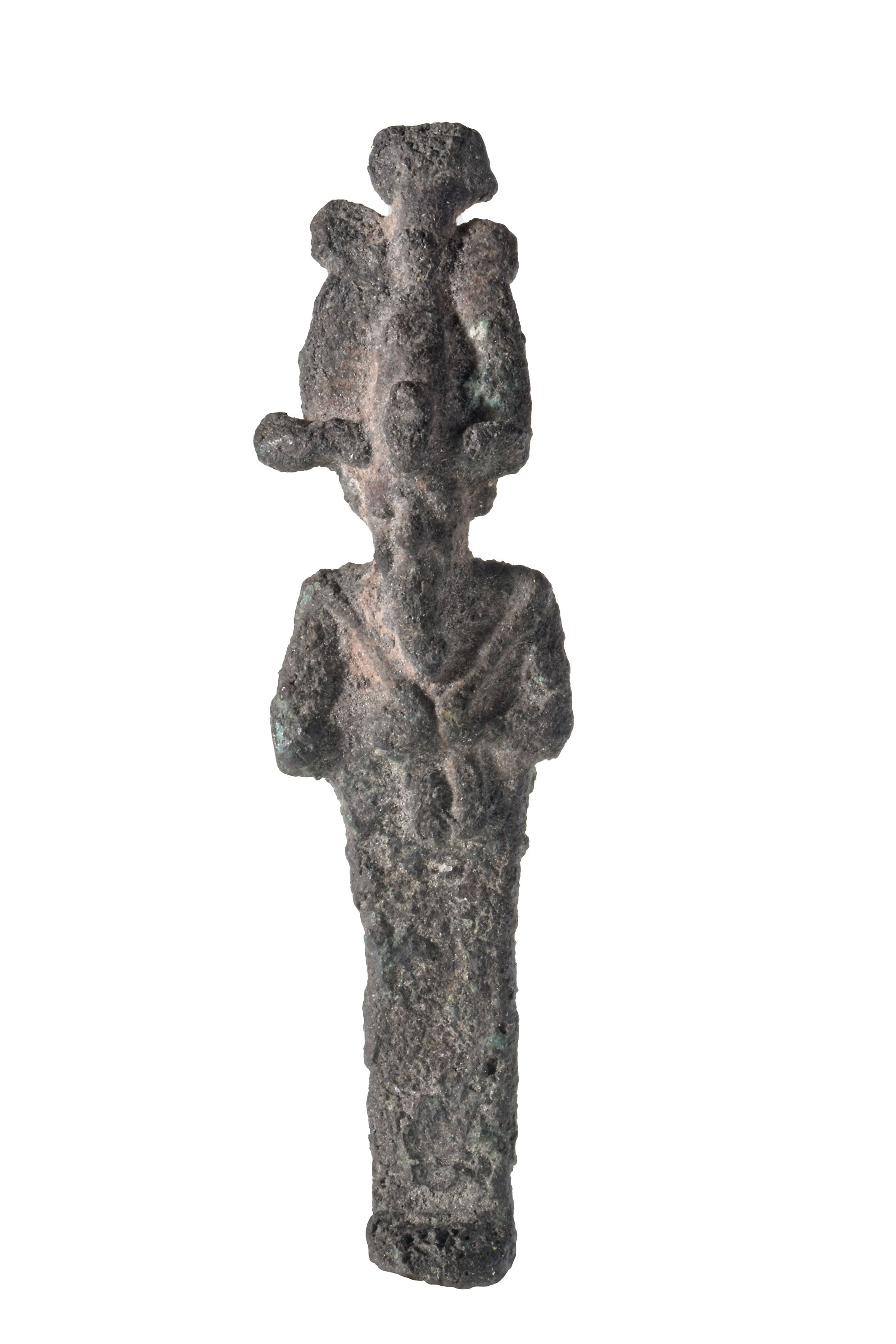 Es handelt sich bei diesem Figürchen um eine ägyptische Kleinbronze, die in die ägyptische Spätzeit datiert. Das Stück stellt den Unterweltsgottes Osiris dar. Er ist bekrönt mit einer Form der ägyptischen Atef-Krone und hält die beiden Reichsinsignien Krummstab und Wedel in den Händen, wobei die Details aufgrund des kleinen Maßstabs und der Korrosion stark verschwommen sind. Seine Mumiengestalt weist ihn damit als Herrscher im Jenseits aus. Figürchen wie diese wurden in großer Stückzahl aus Bronze gegossen und teils zwischen die Mumienbinden gesteckt bzw. ins Grab mitgegeben.