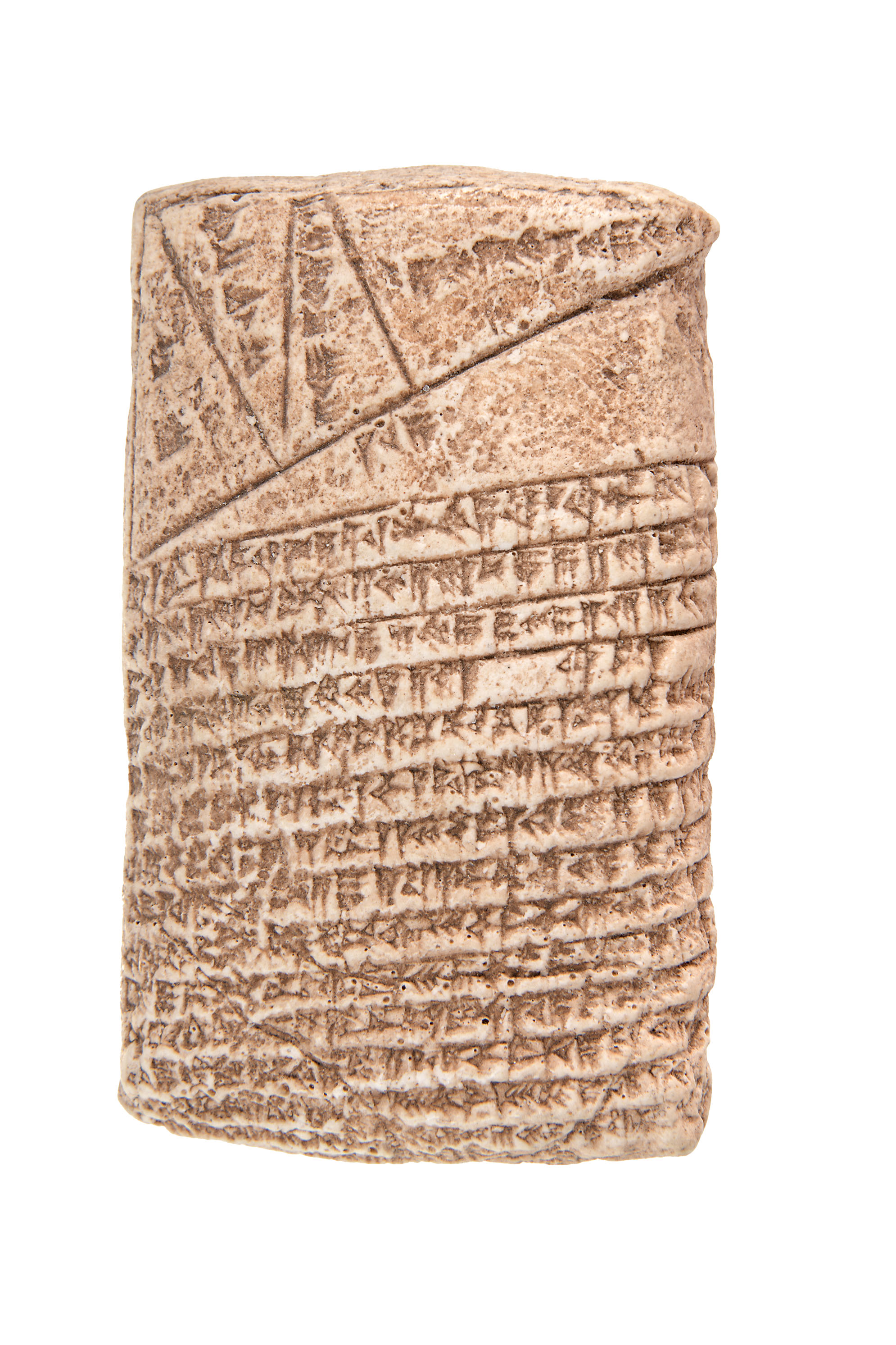 Das Vorbild für diese Abformung einer altbabylonischen Tontafel wurde in der Ruine der Stadt Tell Harmal (Irak) gefunden. Das Besondere an dieser Tafel ist im oberen Bereich sichtbar: Die mathematische Berechnung von Seitenlängen und Flächen im rechtwinkligen Dreieck im Sexagesimalsystem. Die Berechnung von Feldgrößen für die Landwirtschaft spielt in den Ackerbaukulturen Mesopotamiens eine prominente Rolle. Die Tafel demonstriert rund 1.500 Jahre vor Pythagoras, dass die Grundlagen der Trigonometrie in Sumer längst bekannt waren und praktiziert wurden. Ähnliche Berechnungen finden sich auf Schülertafeln - und es ist nicht unwahrscheinlich, dass die griechischen Gelehrten ihre Kenntnisse der Geometrie tatsächlich aus dem Alten Orient bezogen haben.