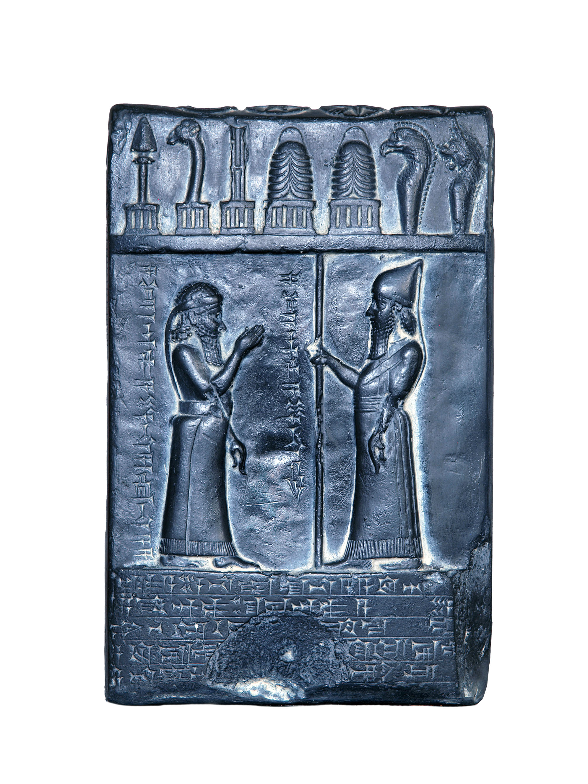 Zu sehen ist die Gips-Replik einer reliefierten Steintafel, die in Südmesopotamien 1883 vom British Museum erworben wurde, nachdem sie 1881 von Hormuzd Rassam in Sippar oder Babylon entdeckt worden war. Aufgrund der Inschrift war sie ursprünglich wohl in einem der Tempel in der Stadt Sippar bzw. Babylon aufgestellt, um dort eine Immobilientransaktion zu vor den Göttern zu dokumentieren. Das Original befindet sich im British Museum (BM 90922).