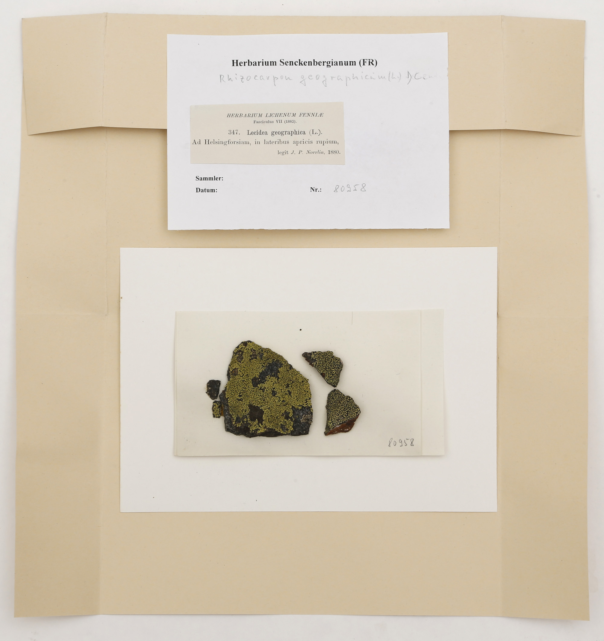 Eine Flechtenart ist die Landkartenflechte (Rhizocarpon geographicum). Sie zählt zu den Gesteinsflechten und ist mit ihrem Untergrund – meist Silikatgestein – fest verwachsen. Dieses hier beschriebene Exemplar wurde 1880 von Johan Petter Norrlin, einem finnischen Biologen, der zwischen 1842 und 1917 lebte, an den sonnigen Seiten eines Felsens bei Helsinki gesammelt und hat seinen Weg später als Tauschbeleg nach Frankfurt in das Herbarium des Forschungsinstituts Senckenberg gefunden. Derzeit befinden sich ungefähr 52.000 Flechtenbelege im Herbarium Senckenbergianum. Es umfasst damit die umfangreichste Flechten-Sammlung Hessens, die auch bundesweit für die Forschung genutzt wird.