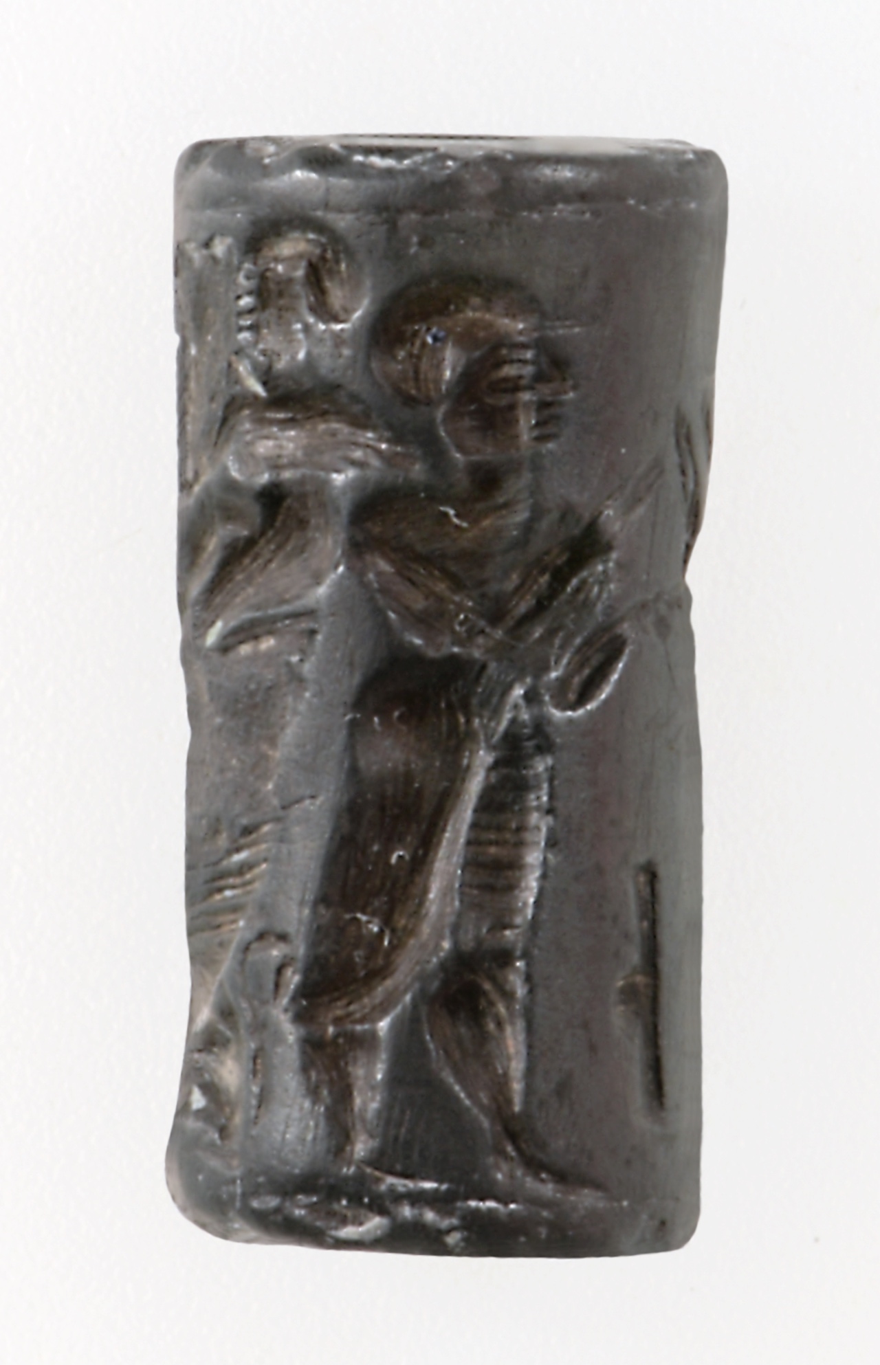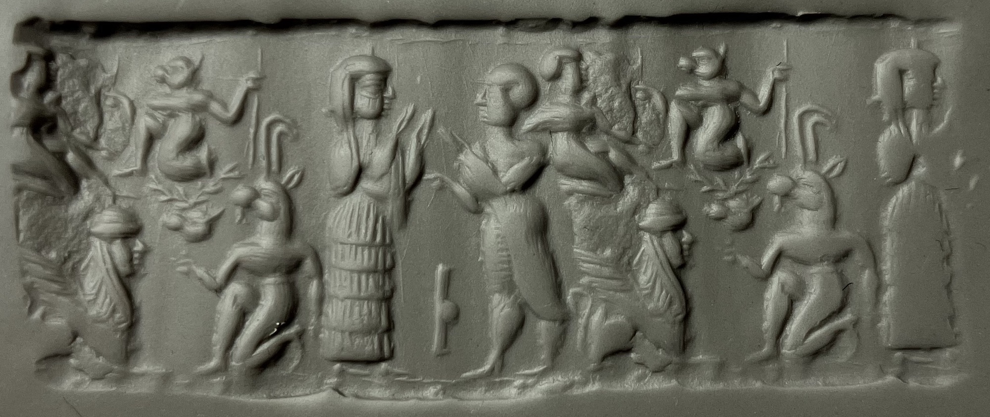Die Motive und der plastische Stil der Gravur spricht für eine Herkunft des Rollsiegels aus Syrien; es dürfte etwa in das 17.-16. Jh. v. Chr. datieren. Trotz der kleinen Größe besticht das Siegelbild durch die feinen Details etwa der Frisuren und Gewänder, die sehr plastisch herausgearbeitet sind.