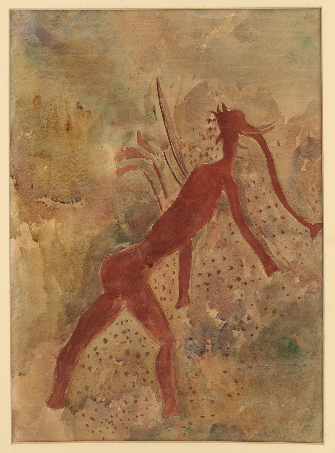 Zunächst handelt es sich bei dem Aquarell Schreitender Mann mit Elefantenkopf der verwalterischen Klassifizierung nach eindeutig um eine Felsbildkopie. Zugleich ist es aber auf Grund der Maltechnik und Materialität ein eigenständiges Werk. Durch die Wahrnehmung und Verwendung der Zeichnung über mehrere Jahrzehnte hinweg kommen weitere Kriterien hinzu, die eine genaue Einordnung als Original oder Kopie erschweren. Aber gerade diese Grenzstellung macht die Felsbildkopie zu einem spannenden Objekt, das zwischen Kunst und Wissenschaft steht. Ursprünglich als Belegkopie einer prähistorischen Zeichnung für Frobenius’ Materialsammlung angefertigt, war sie Teil seiner Wissensgenerierung und -vermittlung. In den 1930er-Jahren wurde das Aquarell neben anderen Zeichnungen der Sammlung in zahlreichen Ausstellungen zur Kulturgeschichte Afrikas und der prähistorischen Felsbildmalerei in Deutschland und vielen europäischen Städten gezeigt. Die ungewöhnlichen Abbilder bis dato unbekannter prähistorischer Kunst begeisterten ein breites Publikum im In- und Ausland und inspirierten viele moderne Künstler dieser Zeit. Auf Grund des Erfolges wurden die Felsbildkopien schließlich 1937 unter dem Titel Prehistoric Rock Pictures in Europe and Africa zusammen mit Werken von Paul Klee (1879 – 1940), Hans Arp (1886 – 1966) und Joan Miró (1893 – 1983) im Museum of Modern Art in New York präsentiert und gingen im Anschluss auf Tournee durch die Vereinigten Staaten von Amerika.