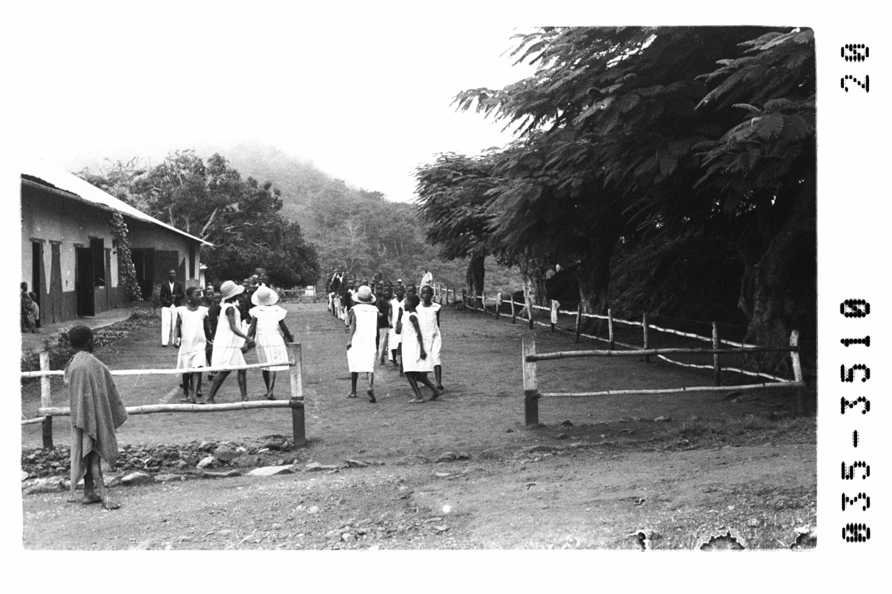 Die Szene spielt sich vor einer Missionsschule in Togo ab. Links auf dem Bild ist das Schulgebäude zu erkennen, das einen Verwaltungsraum und mindestens zwei große Klassenräume umfasst. Entlang der Terrasse vor dem Gebäude sind Blumen gepflanzt. Der Schulhof ist mit Holzstöcken und auf dem Bild kaum erkennbaren Stacheldrähten eingezäunt. Am Eingang des Hofs, vor dem Zaun, steht ein Junge, der die Schüler beobachtet. Es ist vorstellbar, dass er die Szene mit Bewunderung oder gar mit Neid verfolgt. Er ist kein Schüler, sein Körper umhüllt ein großes Tuch, das möglicherweise aus lokaler Produktion stammt. Auf der Terrasse stehen zwei kleine Kinder, die den Auftritt der Kinder ebenfalls verfolgen. Man fragt sich, in welcher Weise sie die beobachtete Szene wahrnehmen.