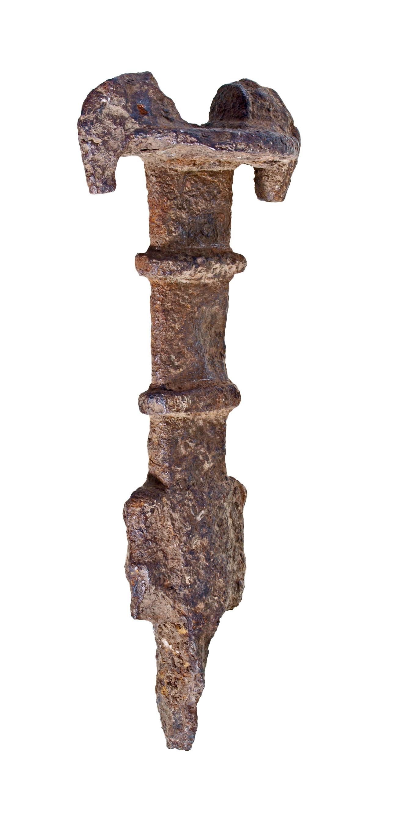 Ab dem 8. und 7. Jh. v. Chr. wurden in Luristan vermehrt Waffen aus Eisen hergestellt. Eine häufig vorkommende Objektgattung waren Schwerter mit Maskengriff. Bei dem vorliegenden Objekt liegt ein Griffteil eines solchen Maskengriffschwertes vor. Der Griff hat einen flachen Querschnitt und ist mit zwei horizontal verlaufenden Wulsten ausgestattet. Das Griffende ist mit einer Knaufscheibe versehen, an welcher zwei stilisierte, bärtige Männerköpfe bzw. „Masken“ gegenständig angebracht sind und jeweils nach außen blicken. Am Übergang von Griff zu Klinge befinden sich vermutlich geometrische Dekorelemente, die aufgrund starker Korrosion nicht näher erkennbar sind. Häufig befinden sich an dieser Stelle bei Maskengriffschwertern zwei weitere menschliche Masken. Die Schwertklinge ist abgebrochen.