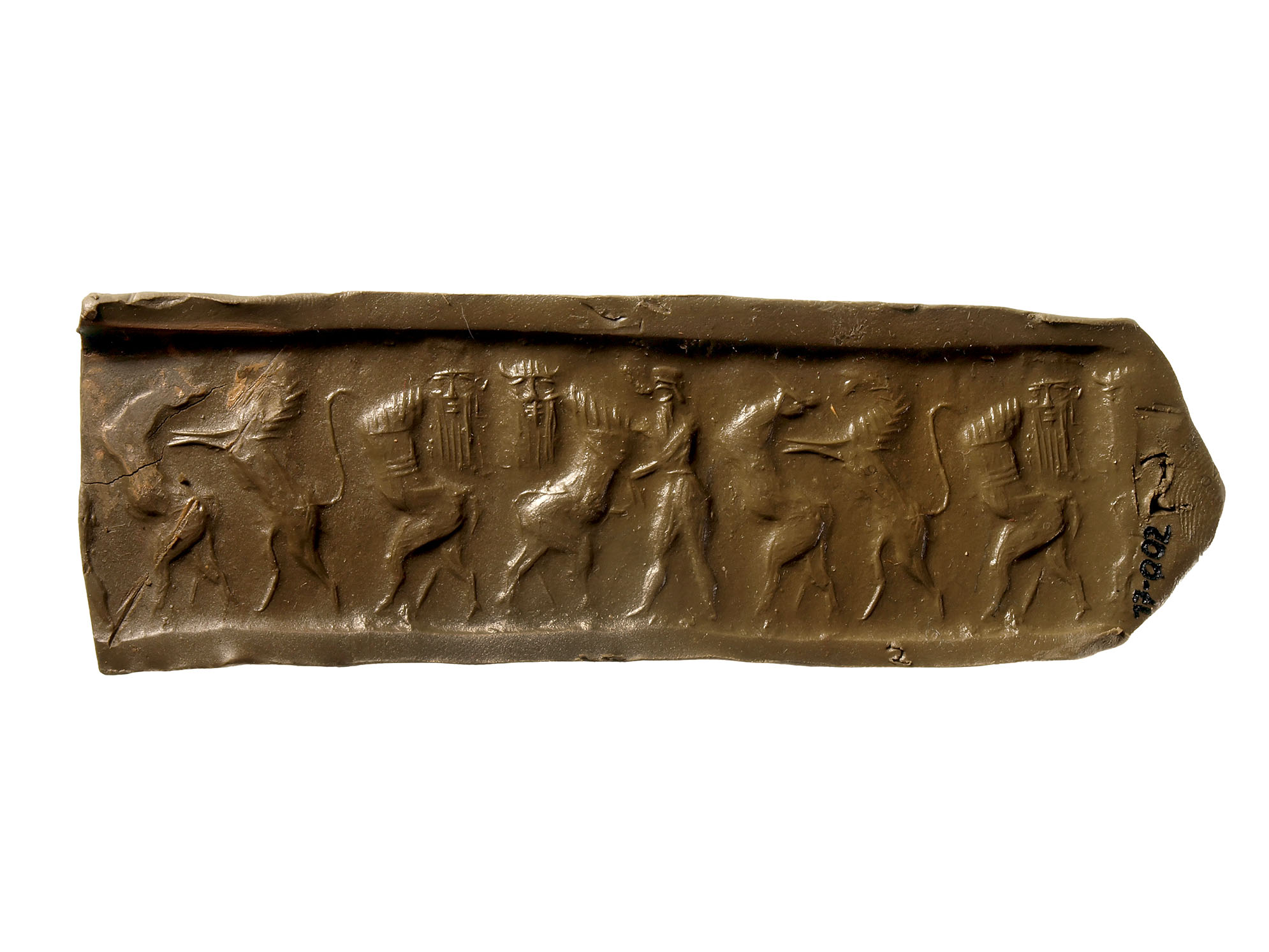 Auf der Abrollung eines Rollsiegels ist ein Figurenband zu sehen, welches sich aus einer Dreiergruppe und einer Zweiergruppe zusammensetzt. In der Dreiergruppe sind zwei menschengesichtige Wisente antithetisch aufgerichtet, von denen nur der das rechte von einem Helden bezwungen wird. In der Zweiergruppe attackiert ein Löwe ein Rind. Typisch für die Siegel der Akkad-Zeit sind die flache Kopfbedeckung des Helden, die detaillierte Angabe von Muskulatur und Gesicht sowie das in deutliche Kampfgruppe entzerrte Figurenband.