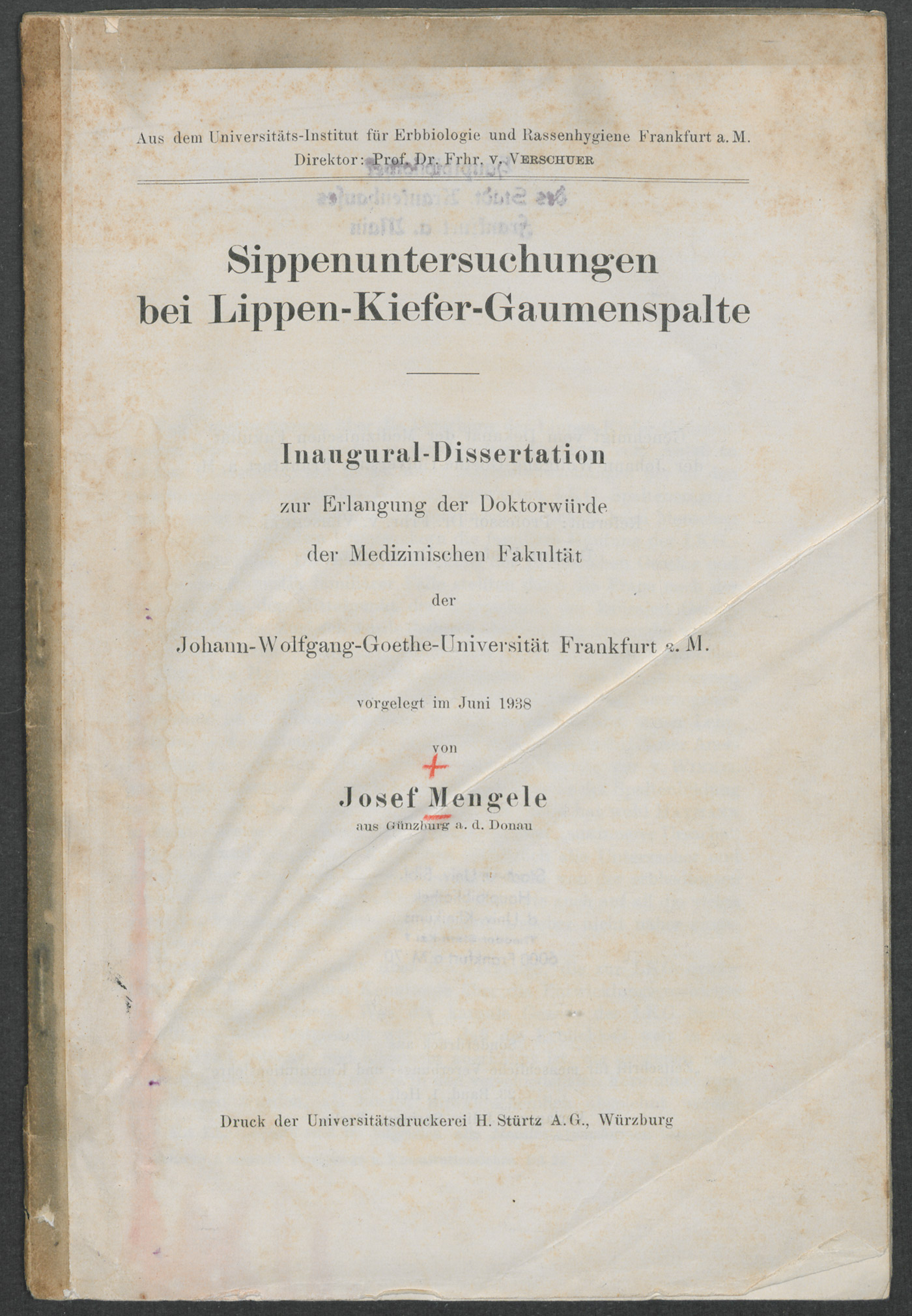 Der SS-Arzt Josef Mengele (1911 – 1979) führte im Konzentrationslager Auschwitz zahllose Menschenversuche durch. Zuvorwar er von 1937 bis 1940 Mitarbeiter des Instituts für Erbbiologie und Rassenhygiene an der Frankfurter Universität, wo er 1938 als Schüler von Otmar Freiherr von Verschuer (1896 – 1969) mit der Note »summa cum laude« promoviert wurde. Seine Dissertation suchte anhand von 17 Probanden die Erblichkeit der Lippen-Kiefer-Gaumenspalte nachzuweisen. Der Doktortitel wurde Mengele 1961 entzogen. Rechtskräftig wurde die Entscheidung jedoch erst 1964, da Mengele aus seinem Exil in Südamerika Widerspruch einlegte.