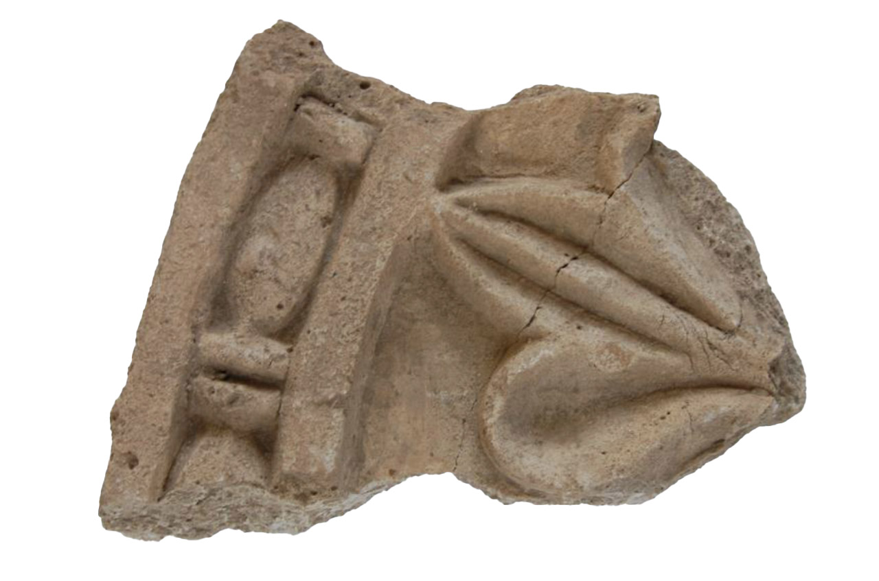 Wir haben hier ein vergleichsweise gut erhaltenes Fragment einer ehemals kreisförmigen Scheibe mit Rosetten und Perlstabdekor. Von den drei Blättern, die auf dem Bruchstück zu erkennen sind, ist das Äußere weggebrochen, in Ansätzen ist der Verlauf zu erahnen. Das mittlere Blatt ist zweigeteilt und besitzt eine Art Schaft, der durch die Mitte des Blattes verläuft. Die Spitze des mittleren Blattes verschmilzt mit dem äußeren Ring, der aus zwei Stegen besteht und in seinem Innenraum ovale, langesteckte Kugel einfasst, die durch Querstege getrennte voneinander sind.
