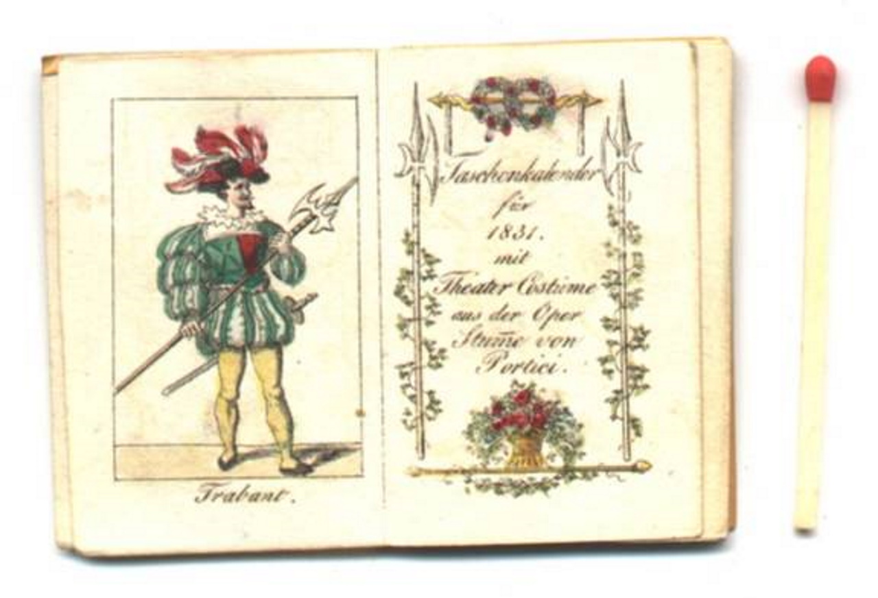 Der Taschenkalender im Format 5,2 x 3,6 cm [!] enthält neben dem Kalendarium und einem Hinweis auf die Sonnen- und Mondfinsternisse des Jahres sieben kolorierte Kostümillustrationen aus der heute weitgehend vergessenen Oper "Die Stumme von Portici" von Daniel-Francois-Esprit Auber (1782-1871), die 1828 in Paris uraufgeführt wurde. Die Titelfigur Fenella ist - ungewöhnlich für eine Oper - stumm. Sie stürzt sich im letzten Akt aus Verzweiflung in die glühende Lava des Vesuvs! Die Handlung spielt vor dem Hintergrund des Aufstandes der Neapolitaner gegen die spanischen Besatzer im 17. Jahrhundert. Die Aufführung der Oper in Brüssel im August 1830 löste Unruhen gegen die Niederländische Herrschaft aus, die letztlich zur Unabhängigkeit Belgiens führten.