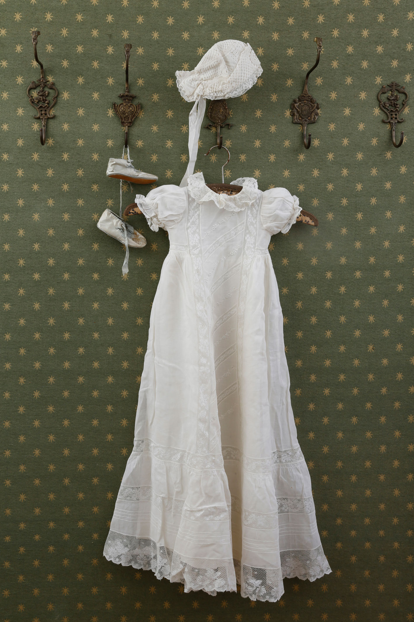 Das Taufkleid ist ein Familienerbstück Eva Demskis (*1944). Vor der Frankfurter Autorin, die kürzlich dem Literaturarchiv der Universität Manuskripte und Kleinode wie dieses Kleid übergeben hat, wurden bereits drei Generationen darin getauft.