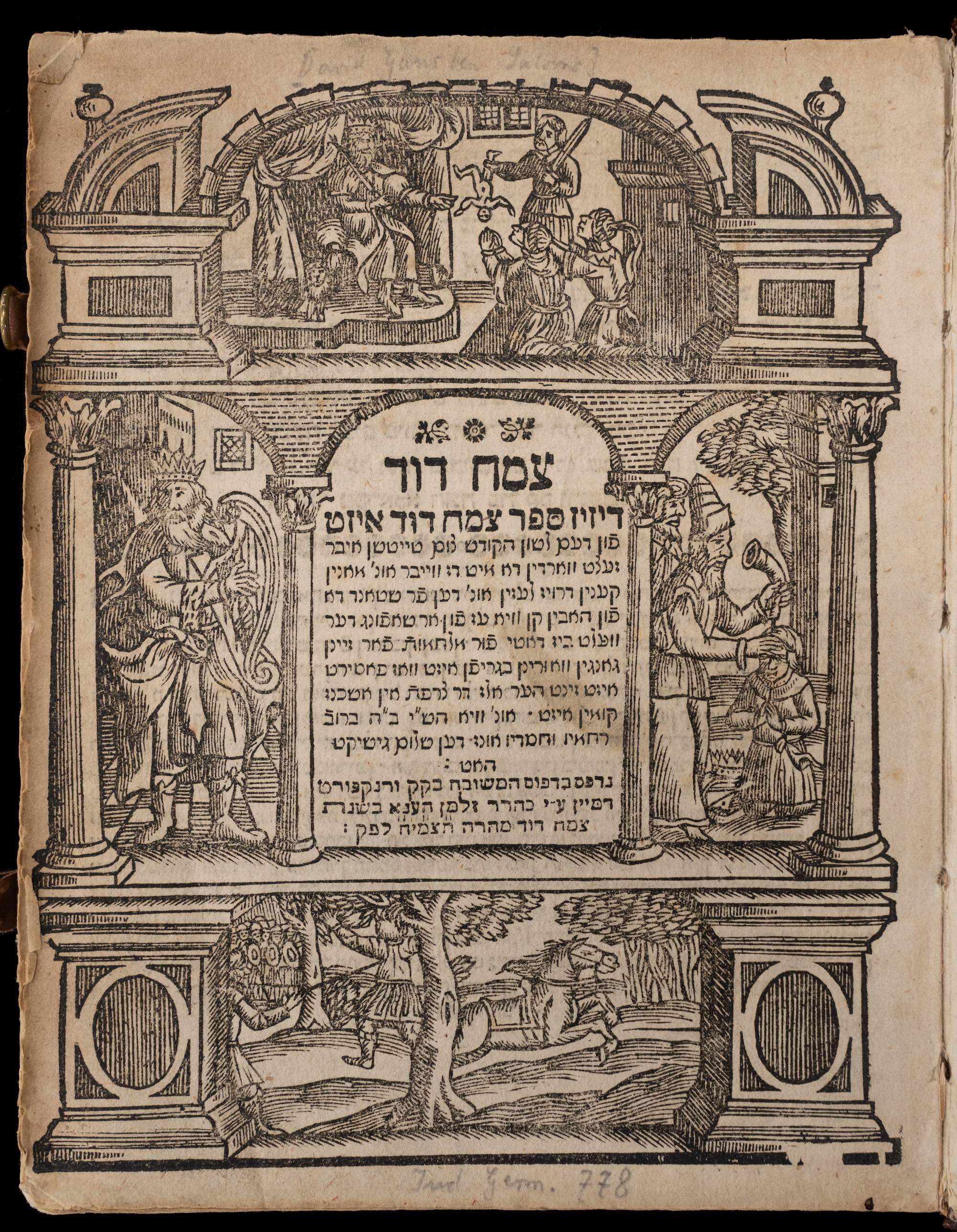 Tsemakh David, first published in Hebrew in Prague in 1592, is the oldest secular Jewish chronicle. Written by David Gans (1541–1613) it describes first the history of the Jewish people since the creation of the world followed by an account of central events in world history, for which the author draws on Christian chronicles and sources. Gans' work has seen several reprints which often were expanded to include more recent events. The University Library Frankfurt holds an unique Yiddish edition of the Tsemakh David, published in 1698, which is less of a translation but rather an extended adaptation of Gans work. It not only offers an account of the most recent history until 1698, but also includes a short section of Frankfurt. Max Holfelder discusses the peculiar features of this edition and explores the work of its printer Zalman Hene, also known as Solomon Hanau. The two parts of this Tsemakh David open with richly illustrated titles pages, decorated with various biblical motifs. Uncommon for Yiddish prints of this time, Zalman Hene was able to obtain a Haskama, an rabbinical approbation. The most significant feature of this Yiddish edition, however, are four separate pages devoted to Frankfurt and significant representatives of the Jewish community, which are bound between the first and the second part. According to Holfelder, Hene aimed to highlight the significance of the Frankfurt community which in his eyes did not get the attention it deserved in previous editions of the Tsemakh David (ibidem, 122). The University Library's copy previously was owned by Baron Carl Wilhelm von Rothschild (1828–1901), and was donated to the former Stadtbibliothek Frankfurt by his widow Freifrau Mathilde von Rothschild (1832–1924).