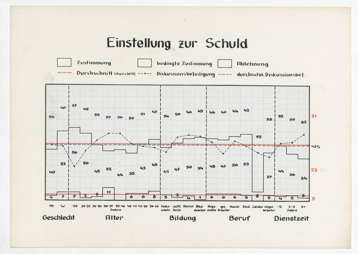 Zurück aus dem Exil widmete sich das 1950 wieder eröffnete Institut für Sozialforschung in einer groß angelegten Studie den Einstellungen der bundesdeutschen Bevölkerung hinsichtlich Krieg, Demokratie und den Verbrechen des Nationalsozialismus. Um auch die sonst öffentlich nicht artikulierten Emotionen mit einzubeziehen, entwickelten die Institutsmitglieder neue Forschungsmethoden und kombinierten standardisierte Einzelbefragungen erstmalig mit Gruppendiskussionen. Ausgangspunkt der Diskussion war ein sogenannter »Gruppenreiz«, der durch seinen provokanten Inhalt eine emotionale Diskussion in Gang setzen sollte. Ein fingierter Leserbrief eines ehemaligen amerikanischen Sergeanten, der von TheodorW. Adorno (1903 – 1969) mit englischem Akzent auf eine Schallplatte aufgesprochen wurde, schildert dessen angebliche Erfahrungen in Deutschland. Ausdrücklich wurde die Diskussionsleitung dazu aufgefordert, affektive Äußerungen zu fördern. Die Diskussionen wurden auf Tonband aufgezeichnet und transkribiert. Grafische Darstellungen fassten die Ergebnisse der Auswertung zusammen, die 1955 unter dem Titel Gruppenstudie. Ein Studienbericht veröffentlicht wurden. Sämtliche Forschungsunterlagen befinden sich heute im Archiv des Institutes und geben nicht nur Einblick in die Mentalität der frühen Bundesrepublik, sondern auch in die Forschungsmethoden der Sozialwissenschaft.